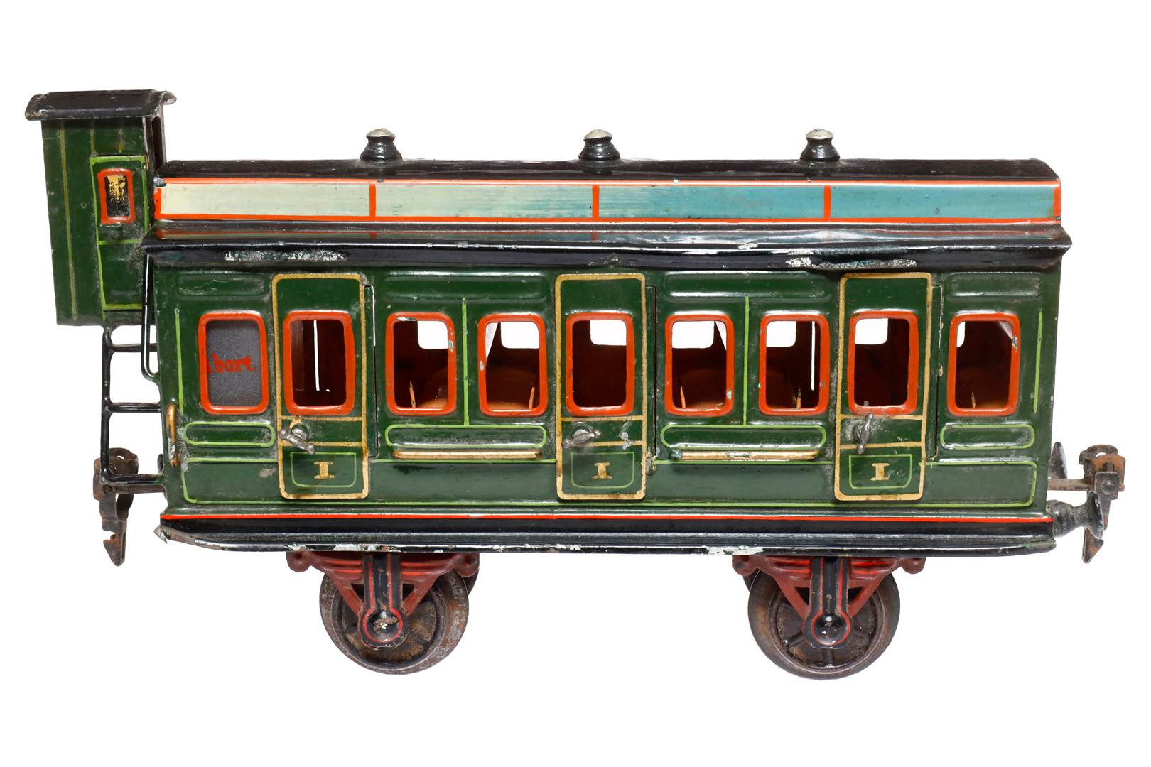 3 Bing Spur 1-Wagen, uralt, CL, tw mit Innenbeleuchtung und Schlusslicht, Alterungs- und Gebrauchsspuren, L 23, Z 3