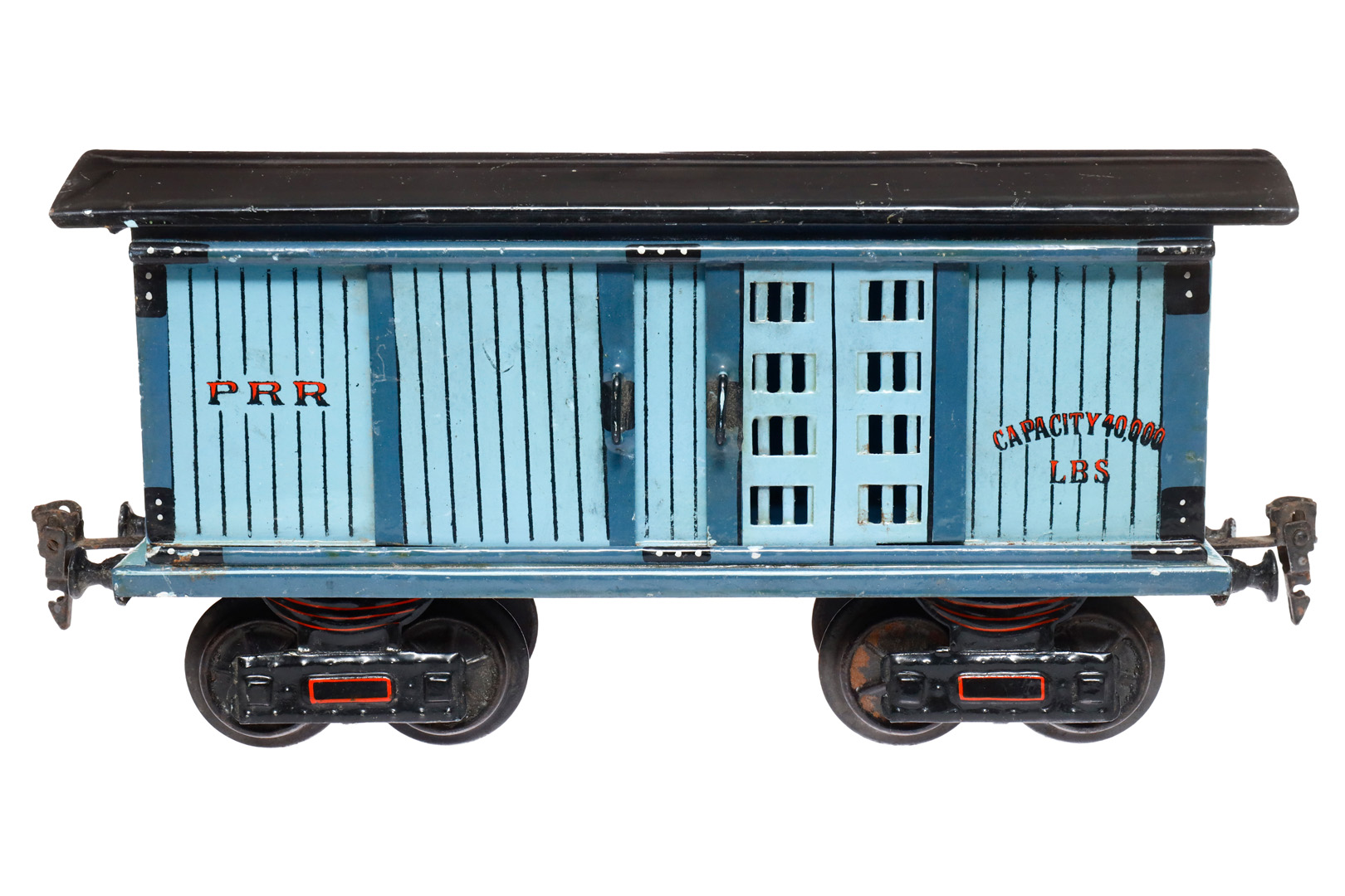 Märklin amer. Güter- und Pferdetransportwagen 1872, Spur 1, uralt, HL, ”PRR”, 4 ST, 4 A, leichte Alterungs- und Gebrauchsspuren, L 25,5, Z 2