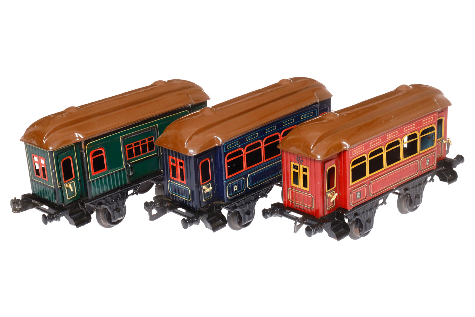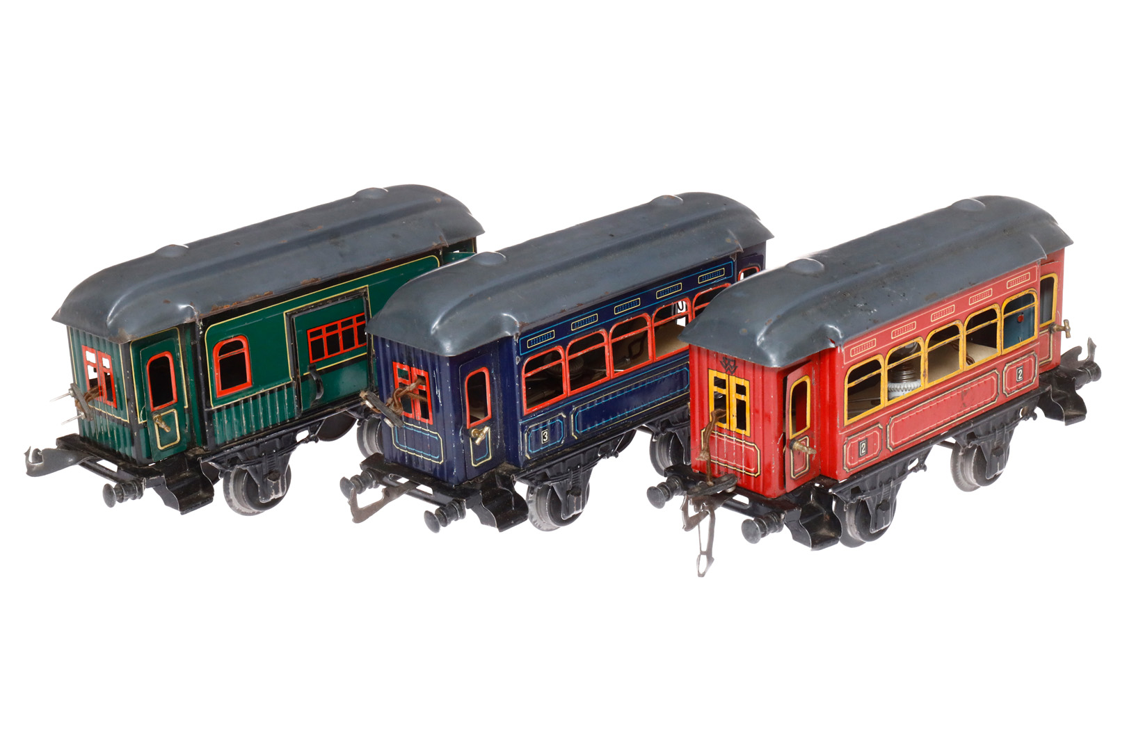 3 Bing Spur 1-Wagen, uralt, CL und HL, leichte Gebrauchsspuren, L 23, Z 2