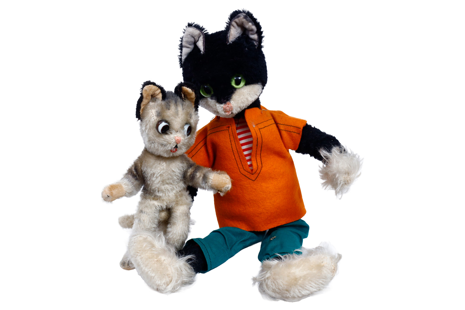 2 Schuco Bigo Bello Katzen, 18 und 40 cm, kleine Fehlstellen, teilw. etwas abgeliebt, bespielt