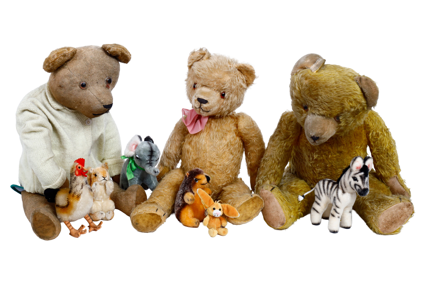 Konv. 3 alte Bären, 48-60 cm, teilw. beschädigt, verstaubt, stark abgeliebt, dazu versch. kleine Tiere