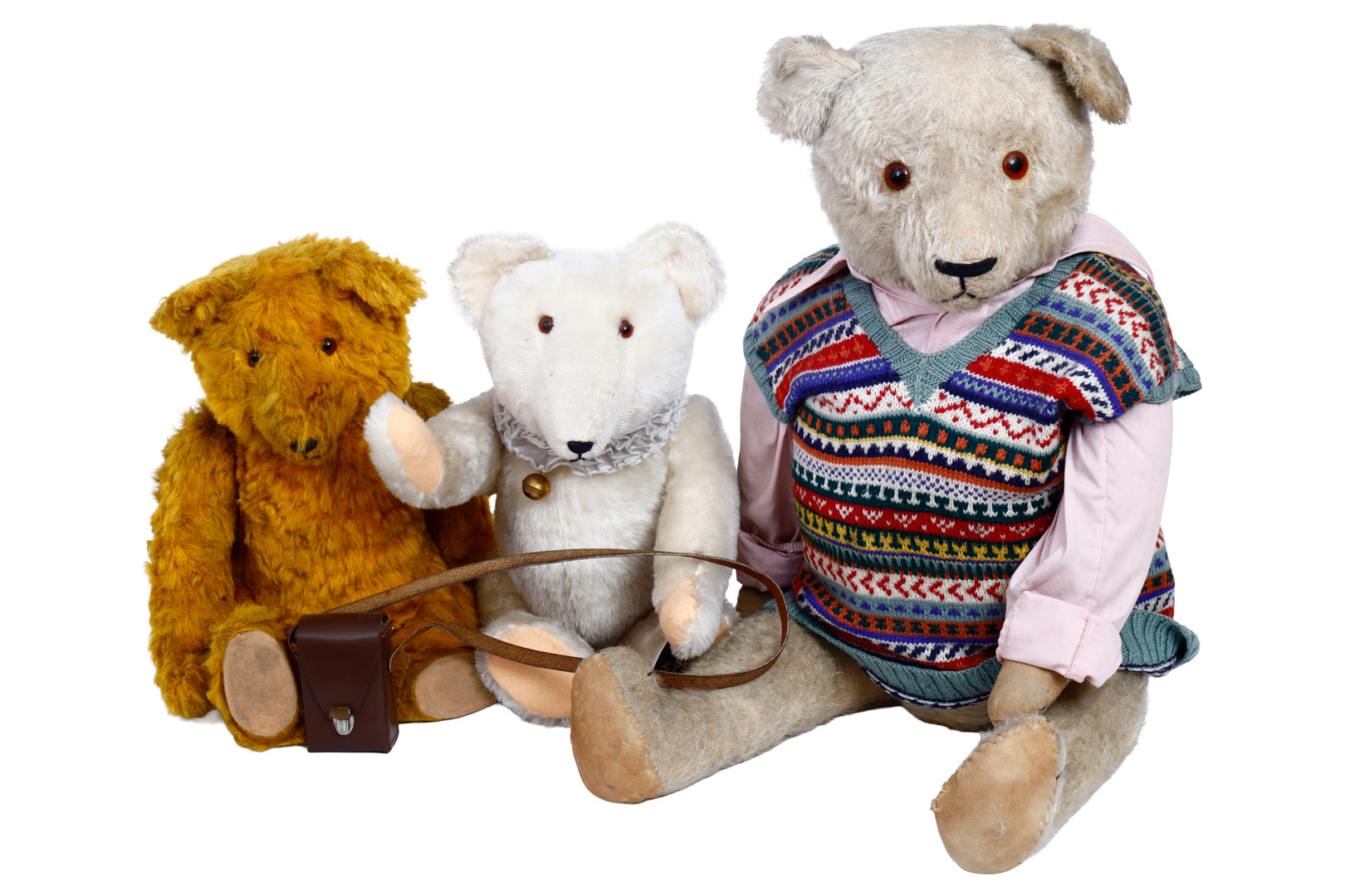 Konv. 3 Bären, 1 x Replik, 53-93 cm, teilw. stark abgeliebt, verstaubt, dazu 1 Fernglas