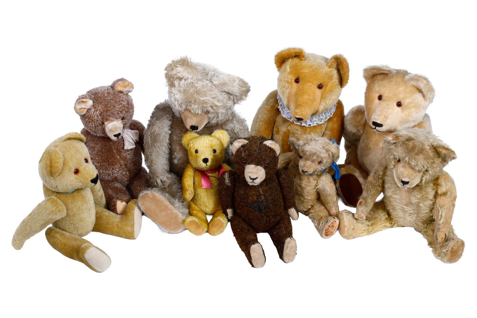 Konv. 9 Bären, teilw. Replik, teilw. beschädigt und stark abgeliebt, verstaubt, 30-60 cm