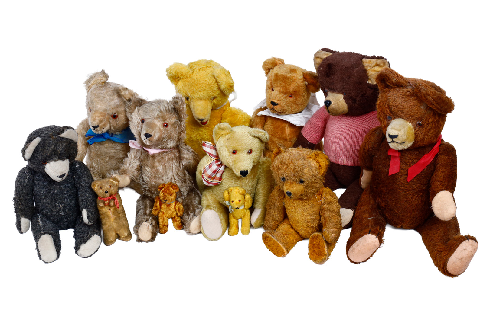 Konv. 12 Bären, teilw. Replik, teilw. beschädigt und stark abgeliebt, verstaubt, ca. 10-45 cm