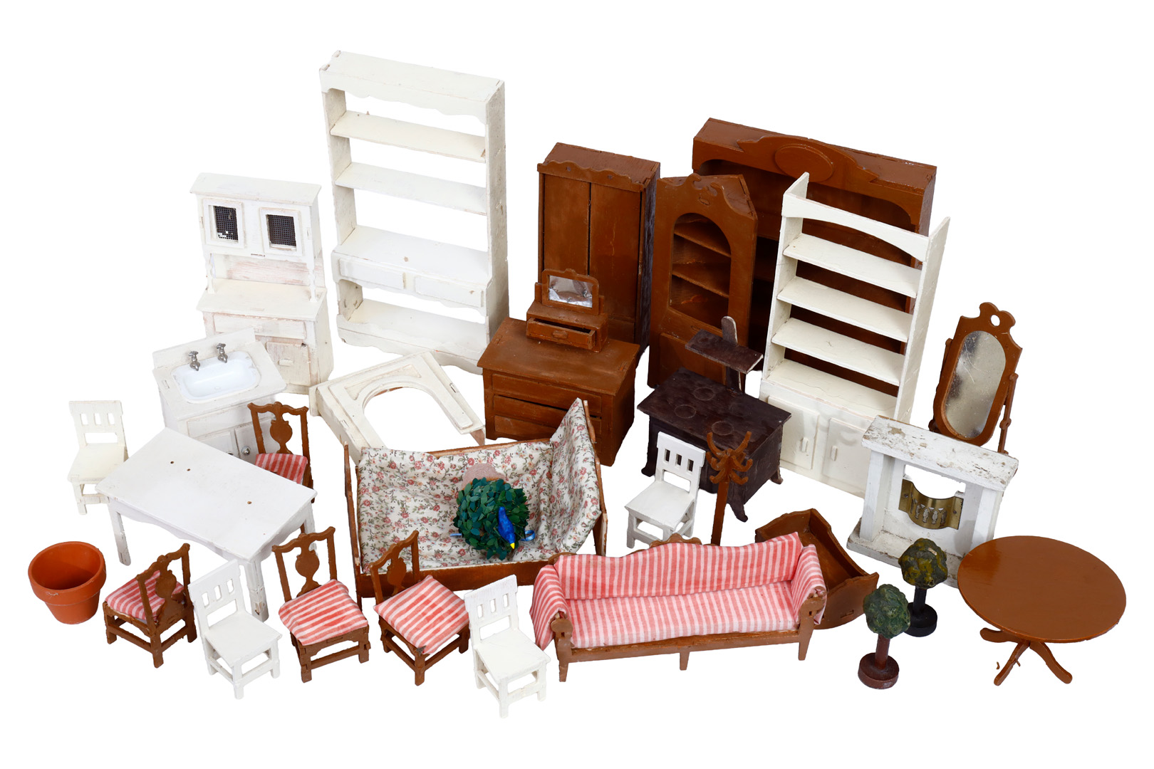 Konv. Puppenstubenmöbel, überstrichen und teilw. beschädigt, Bettlänge 16 cm, zum Herrichten