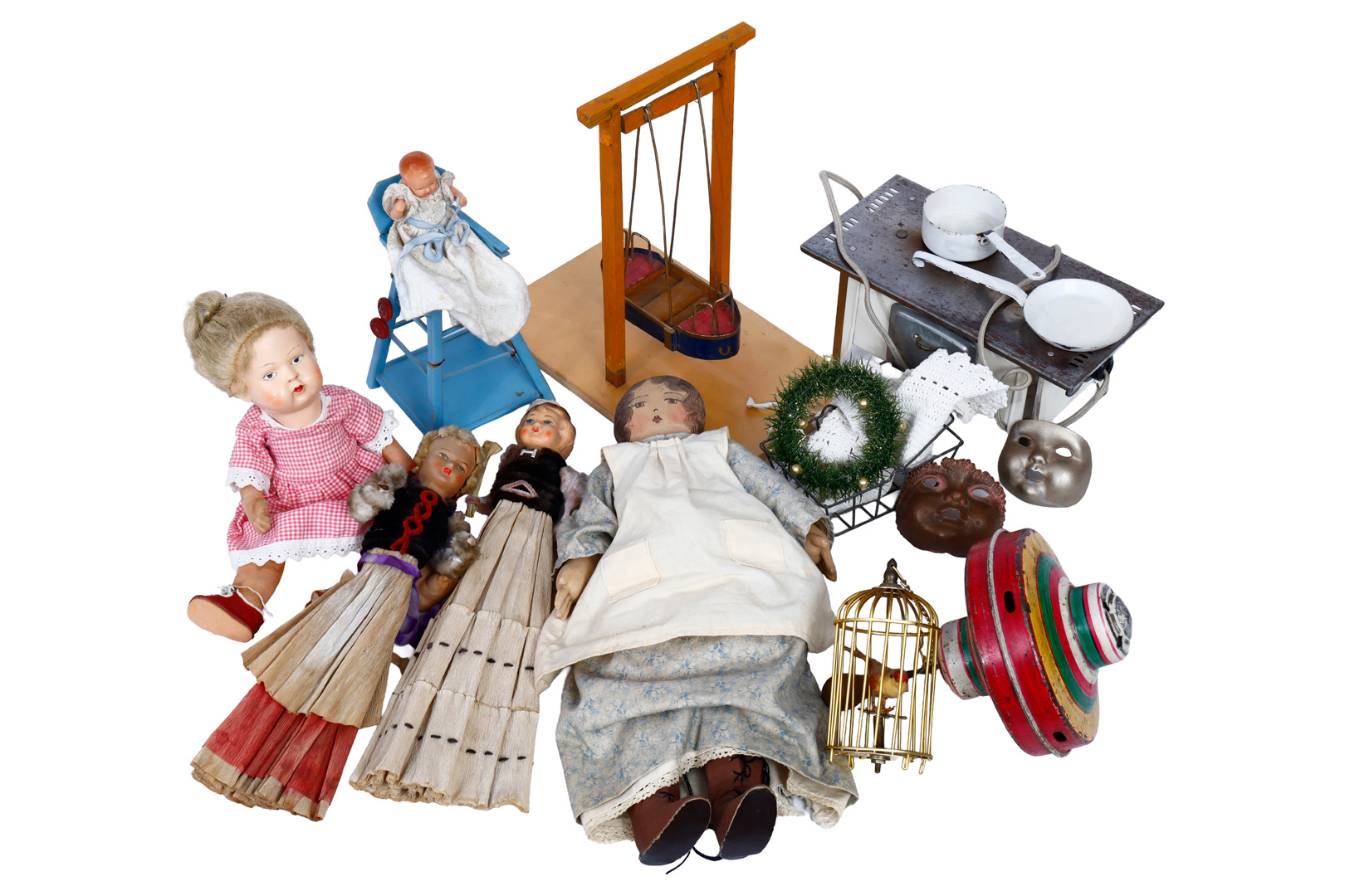 Spielzeugkonv., darunter versch. Puppen, Puppenherd, B 25 cm, Vogelkäfig, Schiffsschaukel etc., teilw. leicht beschädigt, Alterungsspuren