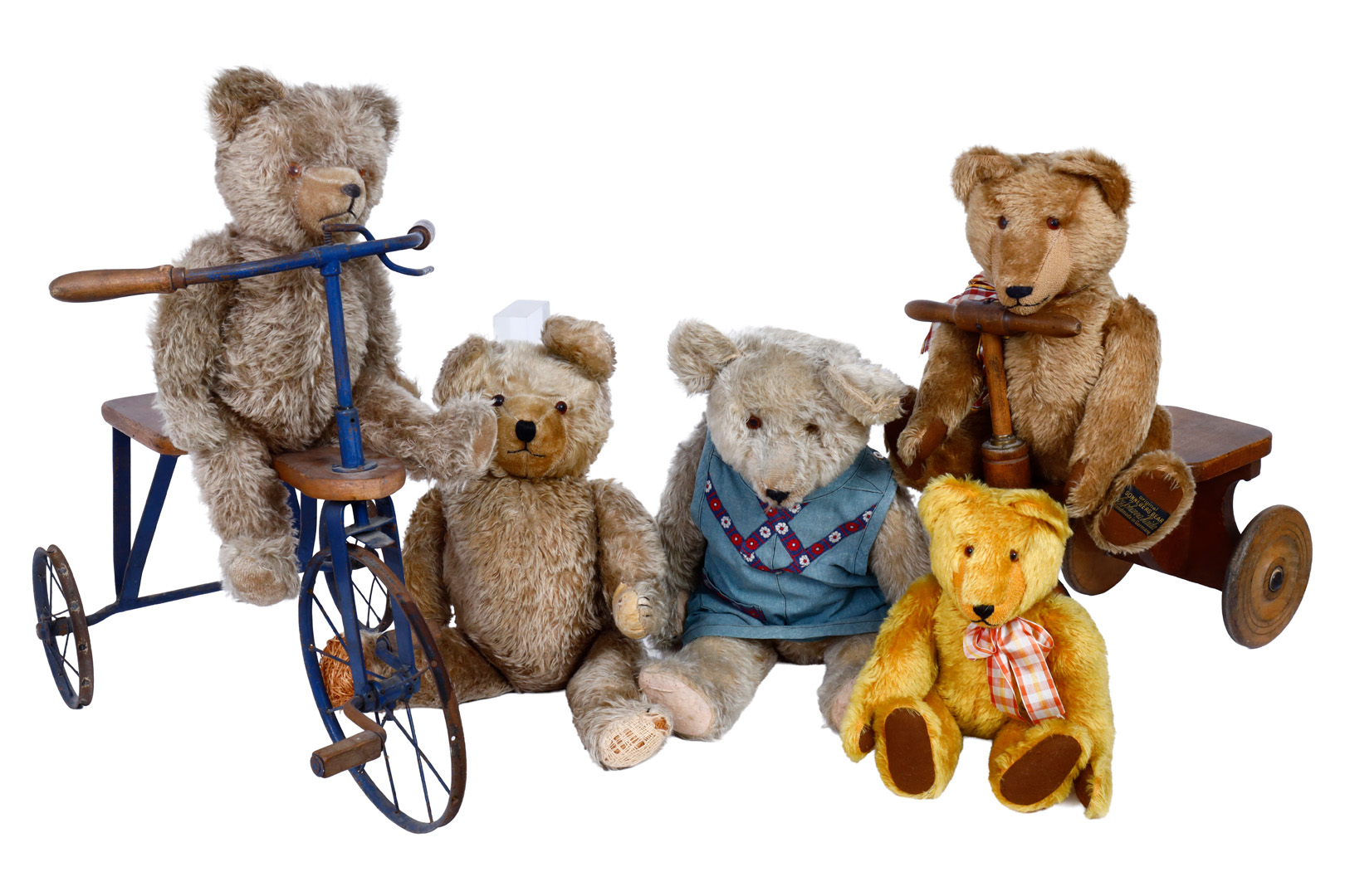 Konv. 5 Teddybären, ca. 40-65 cm, davon 2 Replik, teilw. stark abgeliebt und stellenweise beschädigt, dazu 2 Dreiräder. Kein Versand möglich. Nur Abholung.