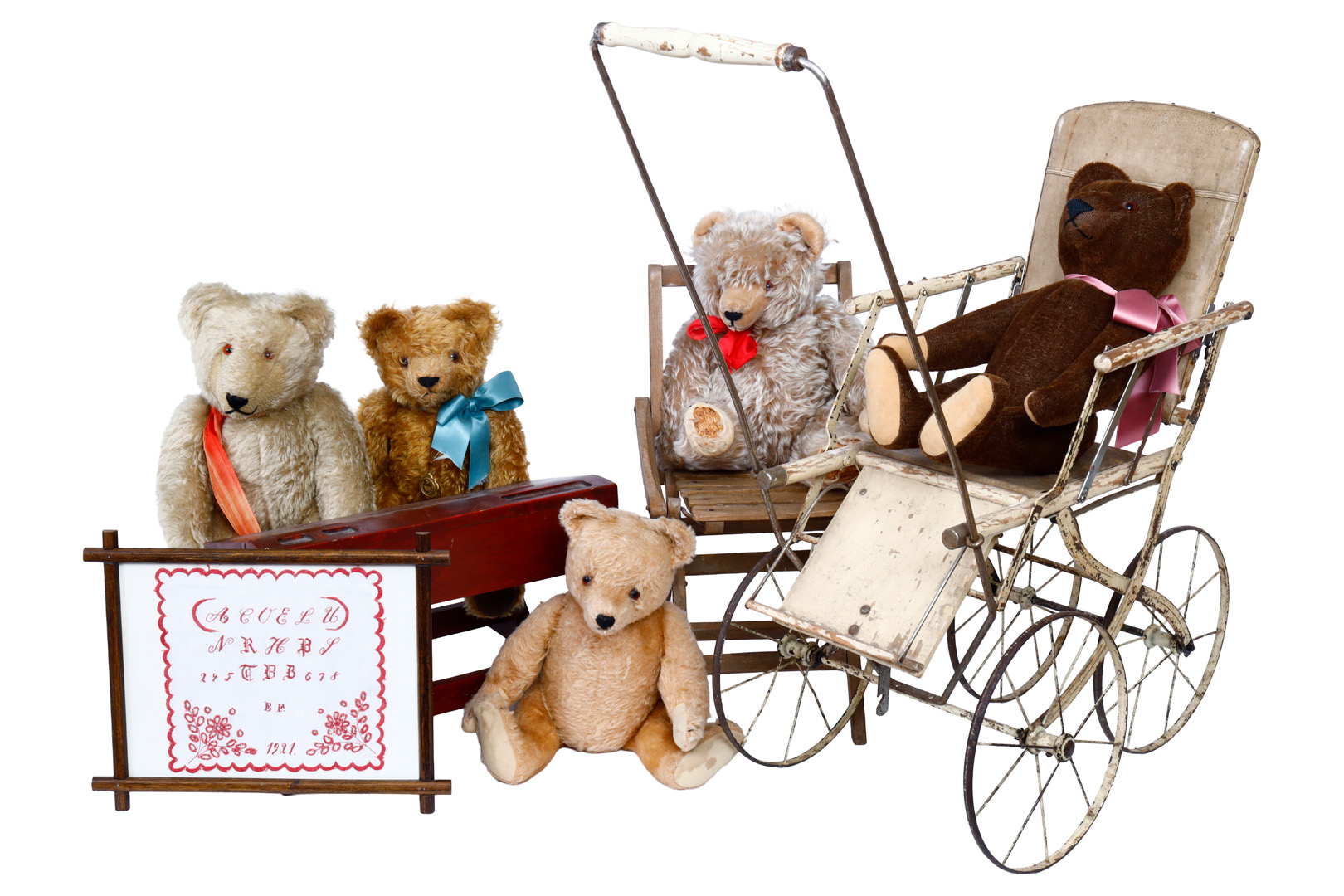 Konv. 5 Teddybären, ca. 40-45 cm, teilw. Replik, teilw. stark abgeliebt und stellenweise beschädigt, dazu 1 Puppenwagen mit starken Lackabplatzungen, 1 Schulbank (Lehne lose), 1 Stuhl und 1 Stickbild, bespielt, verstaubt. Kein Versand möglich. Nur Abholun