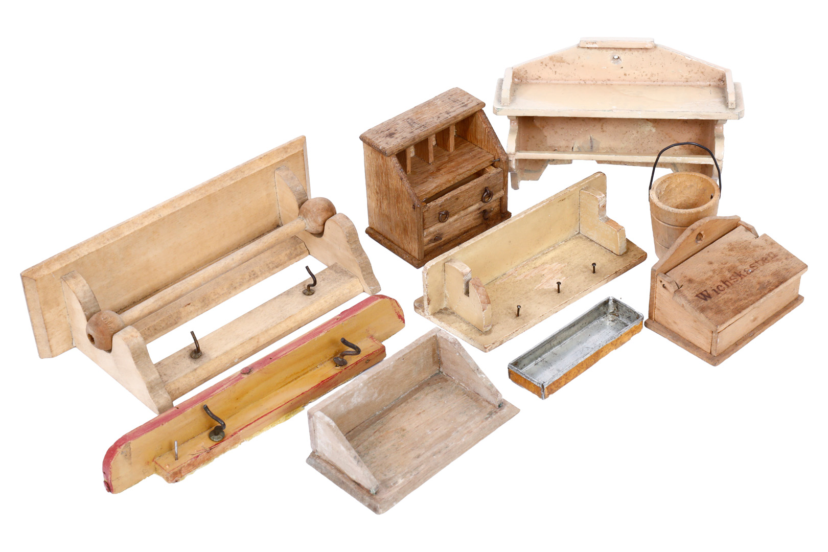 Konv. Holz-Accessoires für die Puppenküche, darunter Wichskasten, L 6,5 cm, Regale etc., bespielt