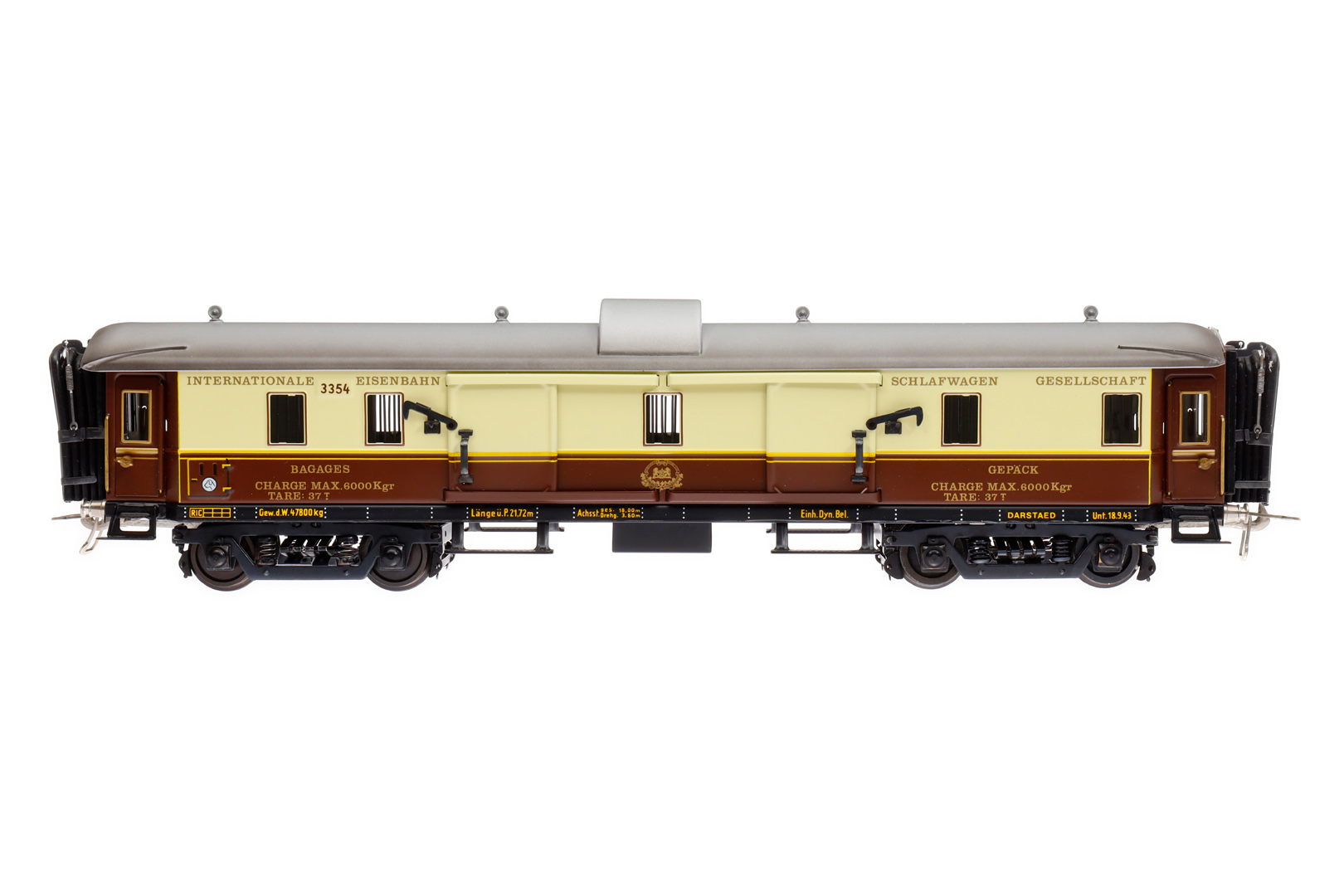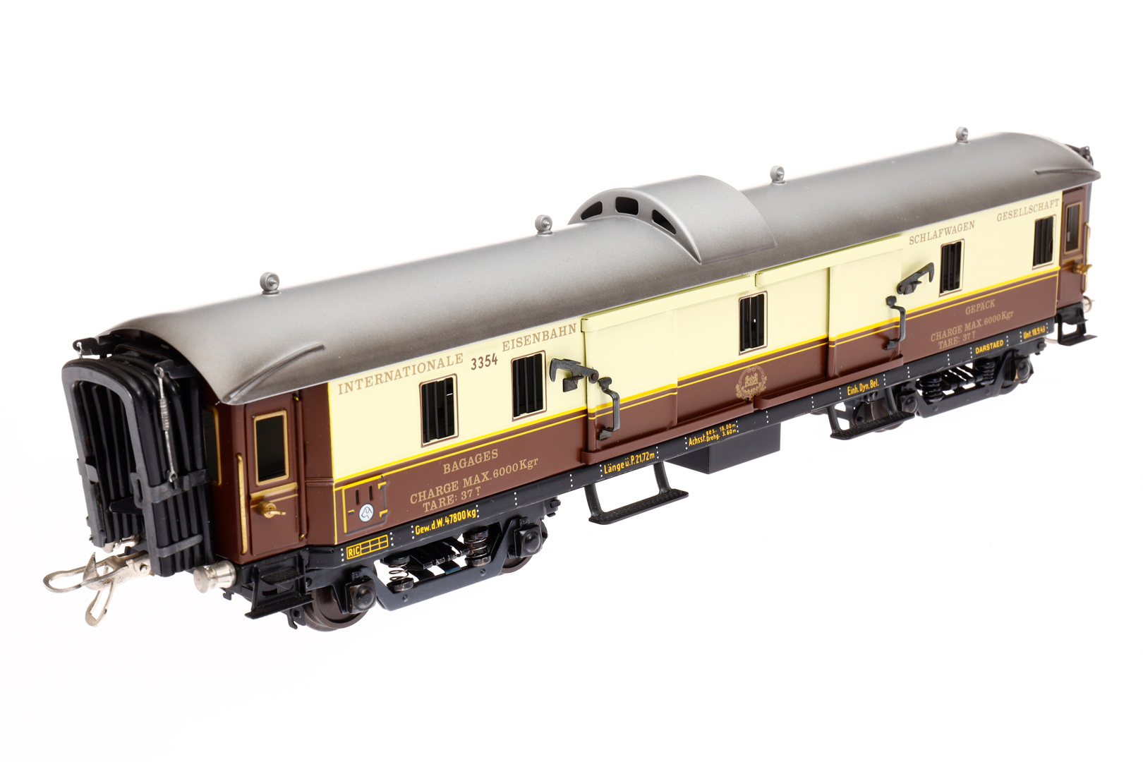 Darstaed int. Gepäckwagen 3354, Spur 0, creme/braun, mit 4 AT und 4 STH, Drehgestelle ersetzt, LS und Alterungsspuren, L 40, im tw besch. OK, sonst Z 1-2