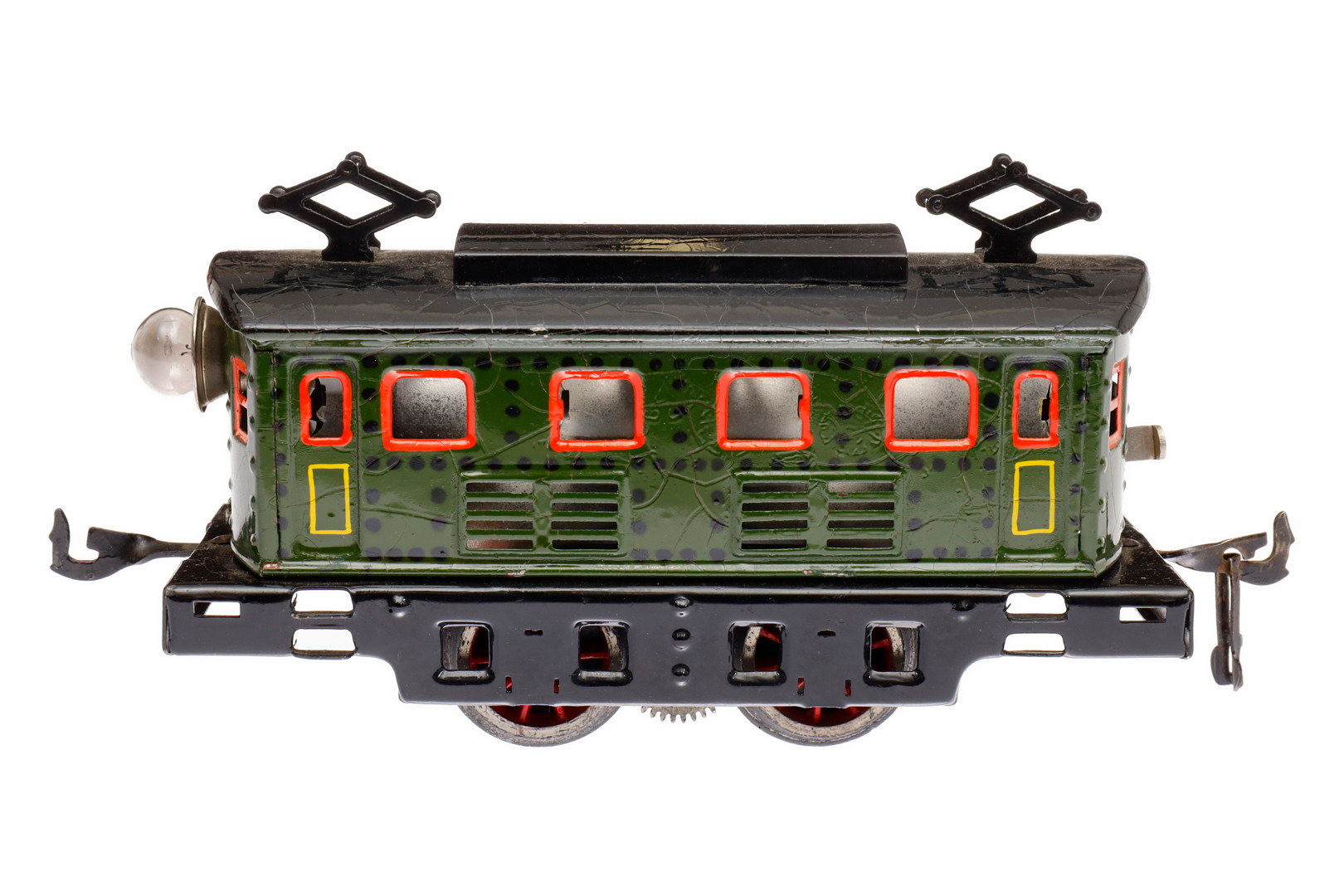 Bing E-Lok, Spur 0, elektr., grün, mit 1 el. bel. Stirnlampe, Achslagerblenden fehlen, LS tw ausgeb., Alterungsspuren, Z 3