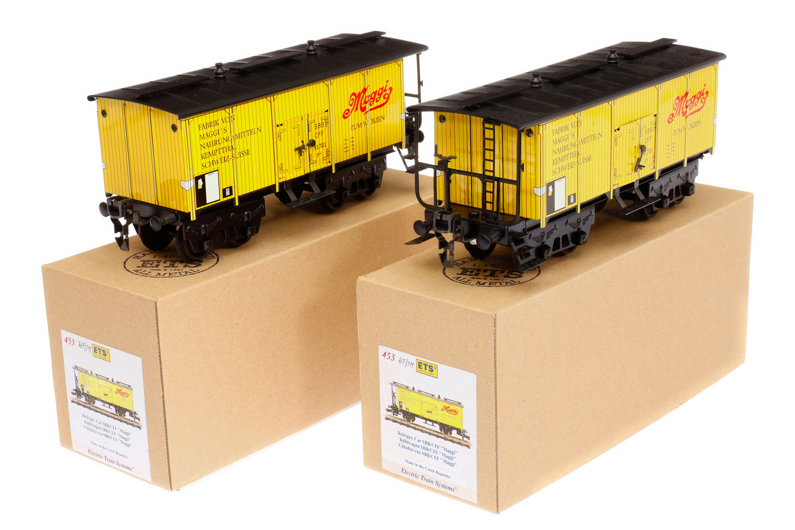 2 ETS Kühlwagen ”Maggi” 453, Spur 0, gelb, Alterungsspuren, OK, Z 1-2