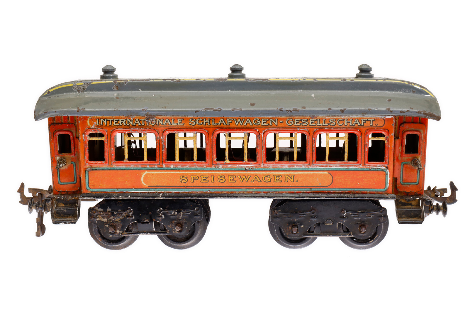 Bing int. Speisewagen, Spur 0, CL, mit Inneneinrichtung und 4 AT, LS und Alterungsspuren, L 21,5, Z 3