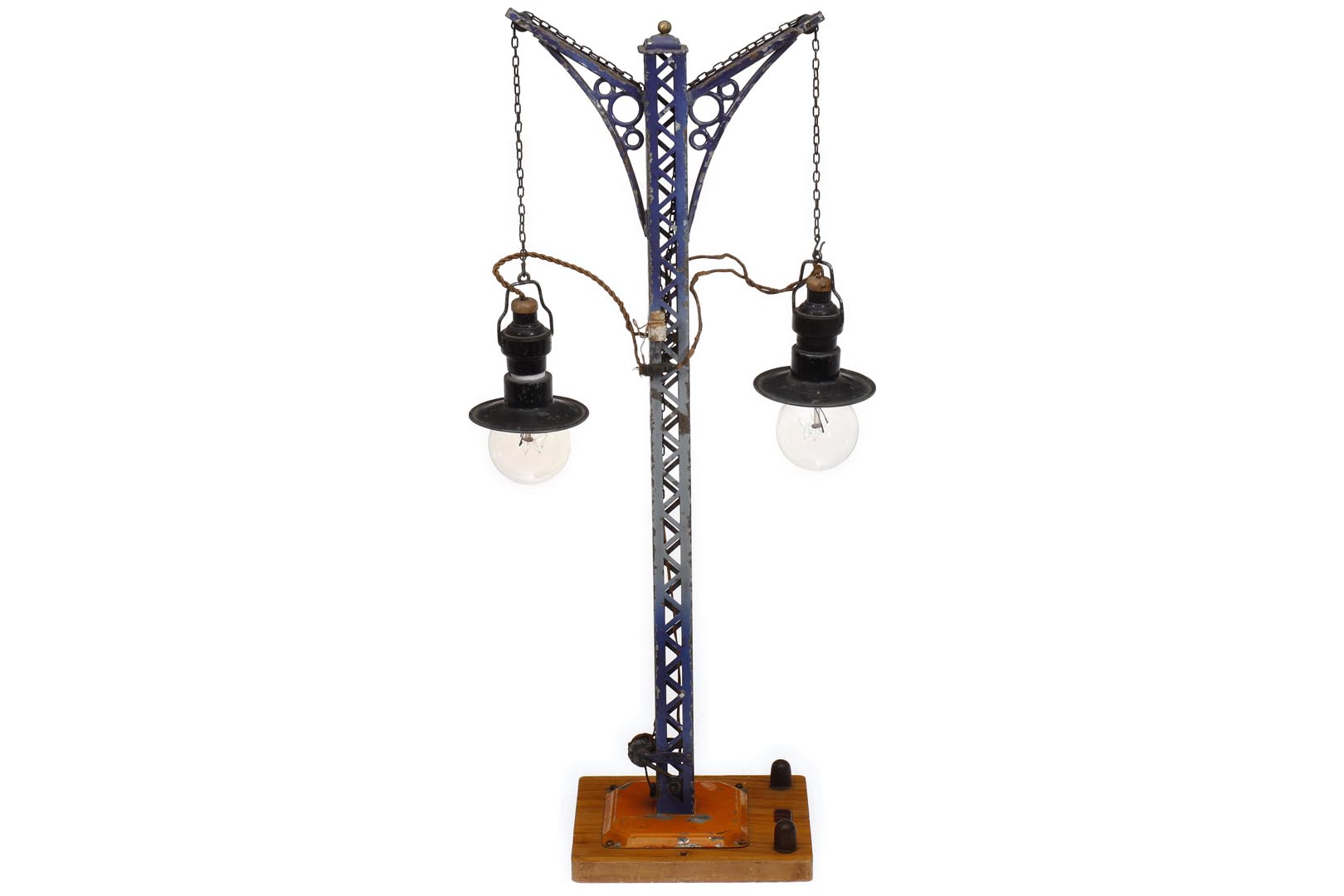Bing zweiarmige Gittermastlampe, uralt, Starkstrom, HL, auf Holzsockel, mit Handkurbel, LS und Alterungsspuren, H 46, Z 3