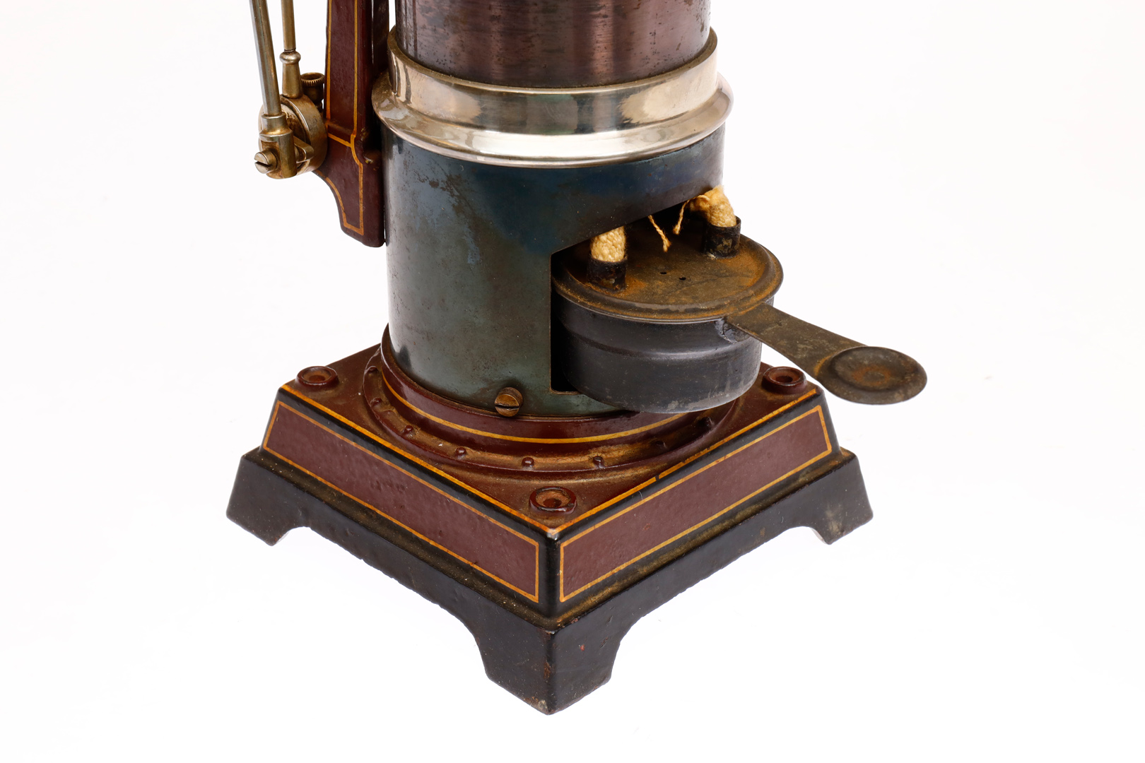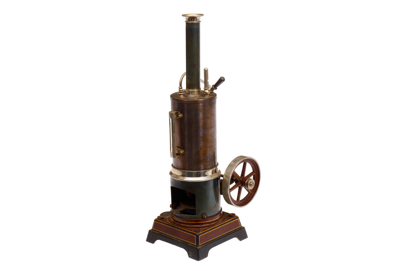 Carette stehende Dampfmaschine, KD 6, mit Brenner, Armaturen und feststehendem Zylinder, auf Gusssockel, HL, alters- und gebrauchsbedingte LS, H 32, Z 2-3