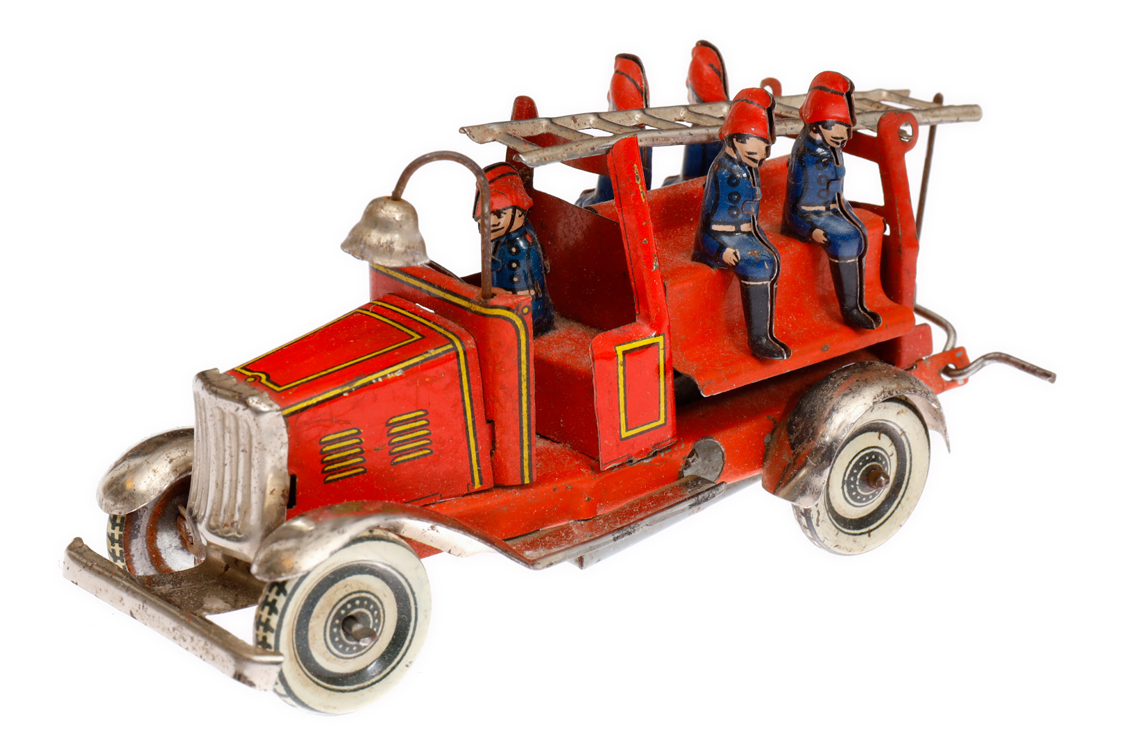 Pennytoy Feuerwehr, Blech, CL, Uhrwerk intakt, mit 5 Figuren, LS, L 11, Z 3