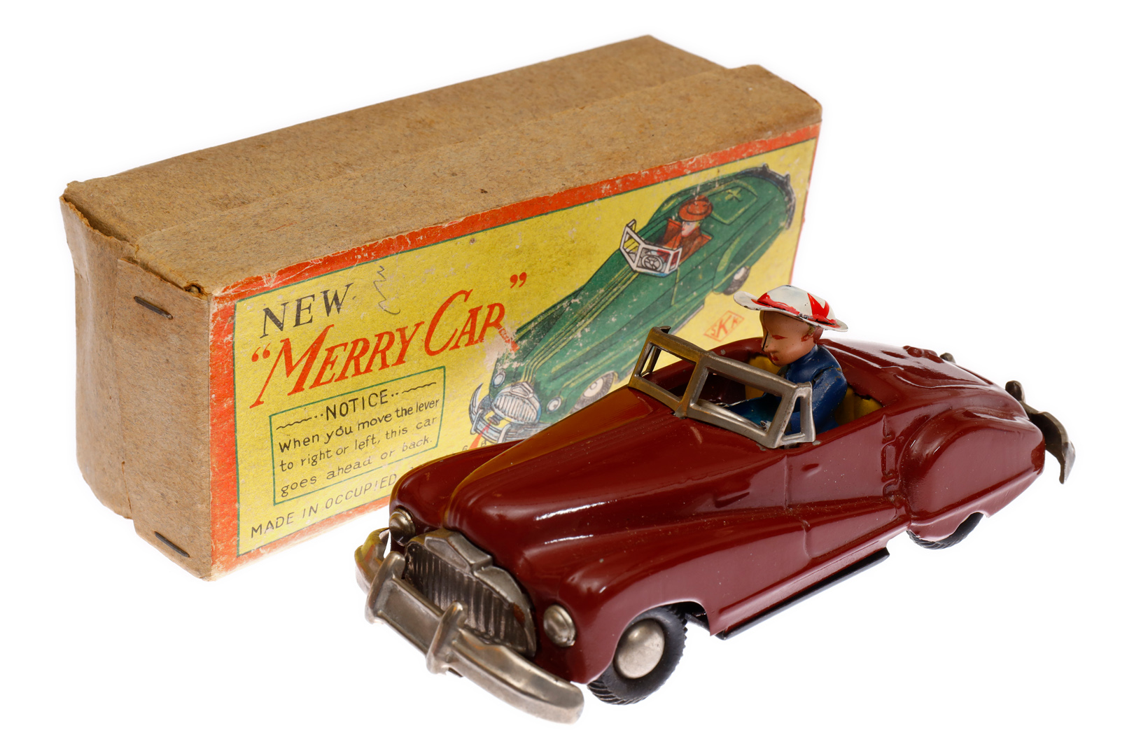 SKK Cabrio ”Merry Car”, Japan, weinrot, Uhrwerk intakt, mit Fahrerfigur, LS und Alterungsspuren, L 14, im tw besch. OK, Z 2-3