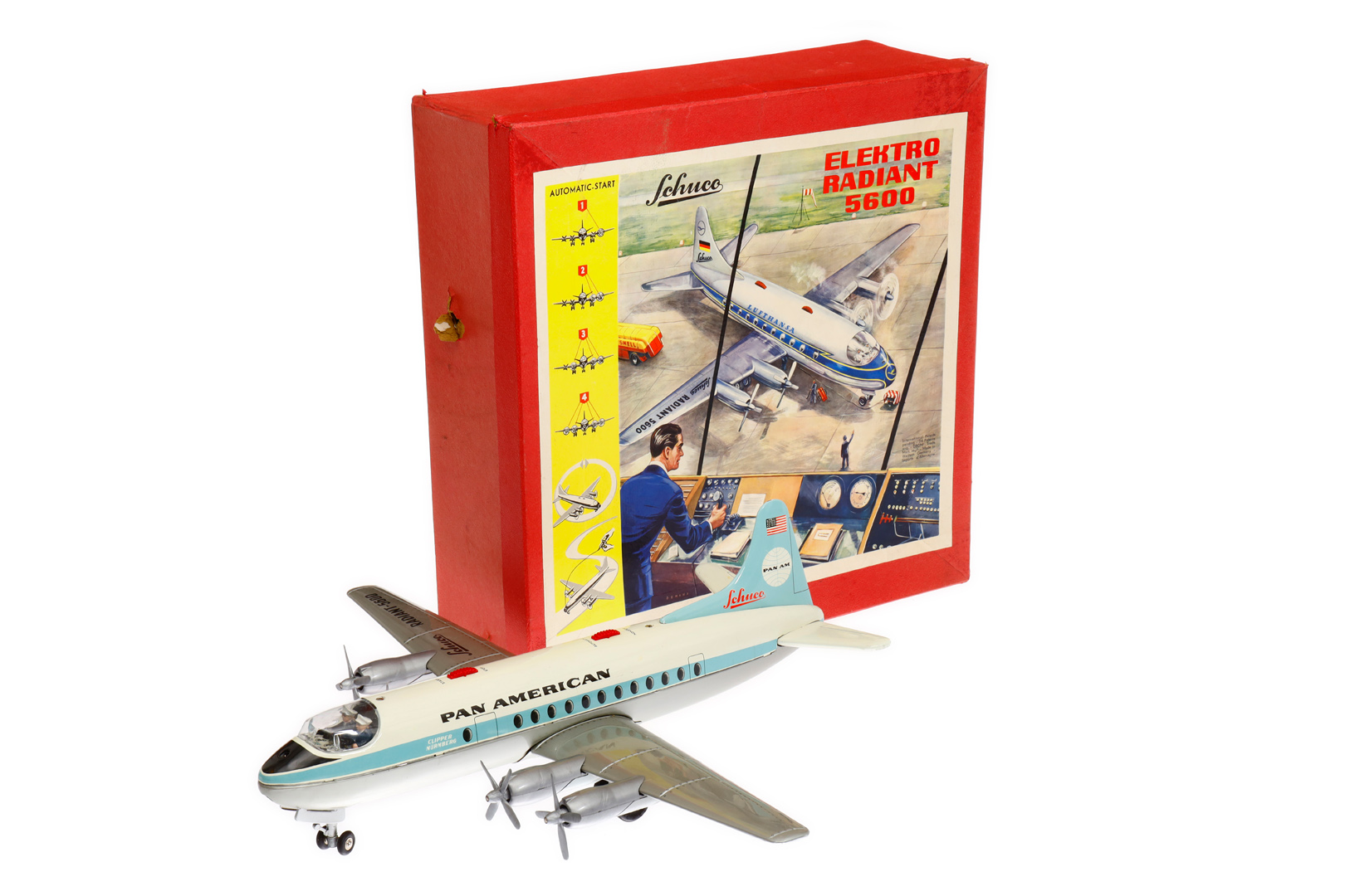 Schuco Flugzeug Elektro Radiant 5600, batteriebetrieben, Blech/Kunststoff, mit Anleitung und Fernsteuerung, Verschluss vom Batteriefach lose, LS und Alterungsspuren, L 41, im tw besch. OK, Innenverpackung NV, sonst noch Z 2