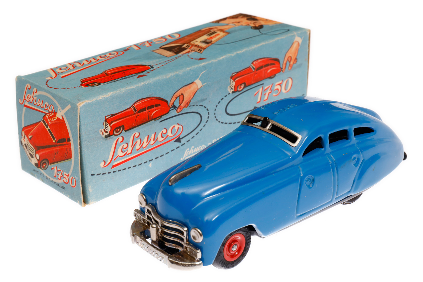 Schuco Auto 1750, blau, Uhrwerk intakt, LS und Alterungsspuren, L 14,5, im leicht besch. OK, sonst noch Z 2