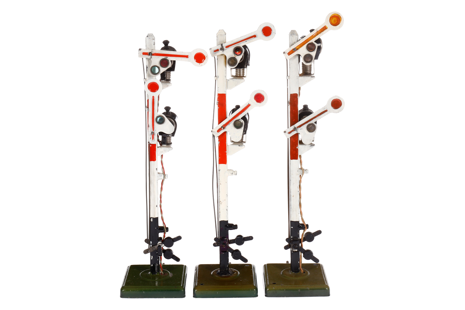 3 Märklin zweiflügelige Hauptsignale, elektr. beleuchtet, tw LS, an einem Sockel Lötspuren, H 28, Z 3