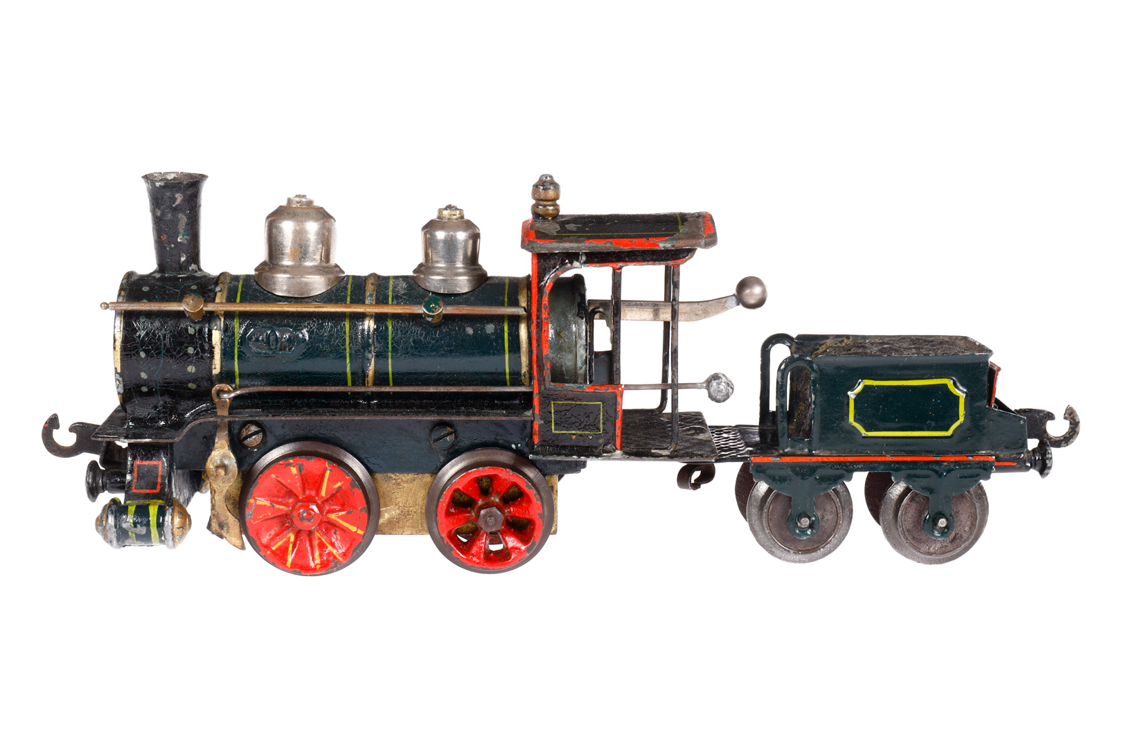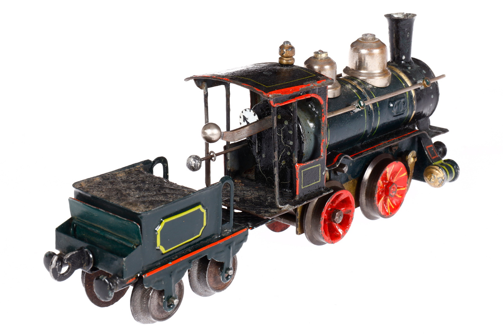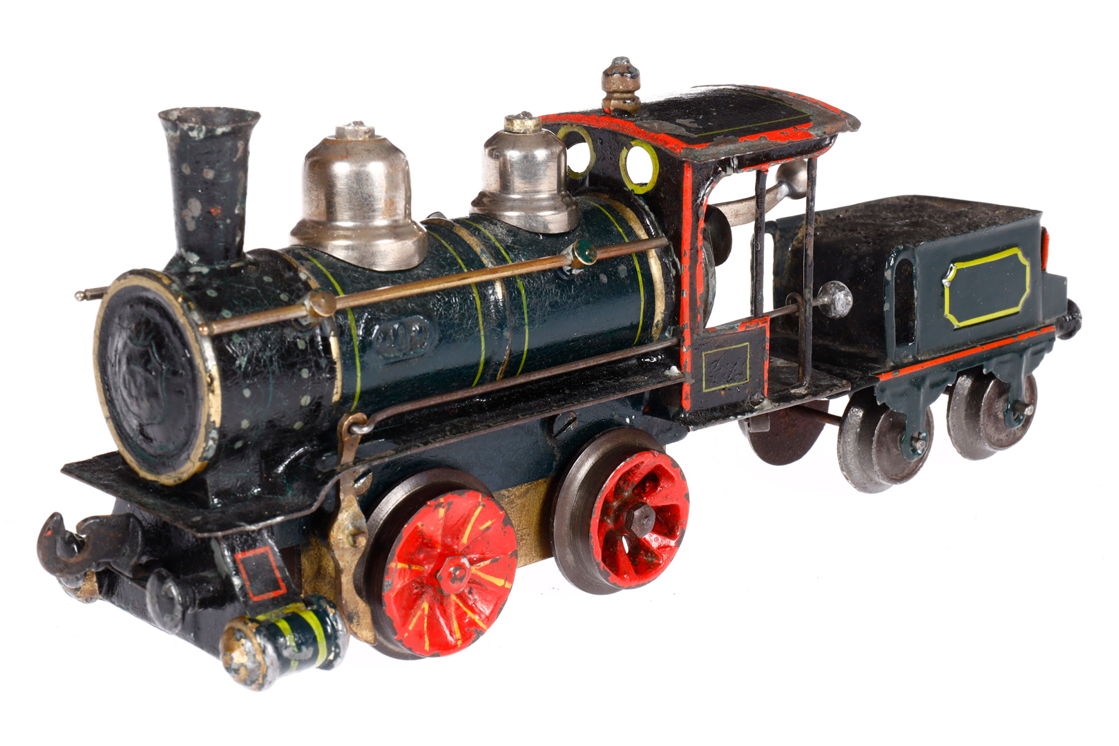 Märklin B-Dampflok 1020, mit 2A-Tender, Spur 0, Uhrwerk intakt, v+r, mit Bremse, HL, Tender farblich rest., Lok tw LS, Alterungsspuren, noch Z 2