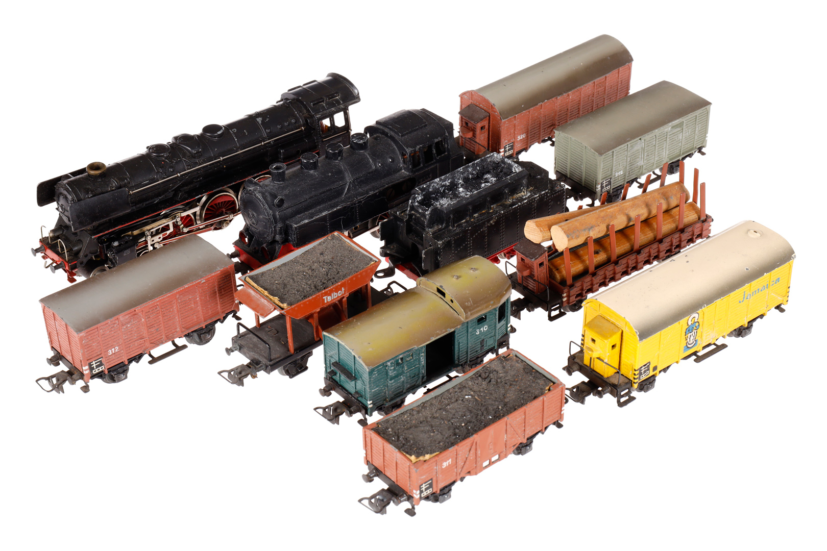 Konv. Märklin Spur H0-Eisenbahn, Tenderlok T 800, 2-C-1 Dampflok 01097, mit Tender und 8 Guss-Güterwagen, tw Zink-Pest, Z 3