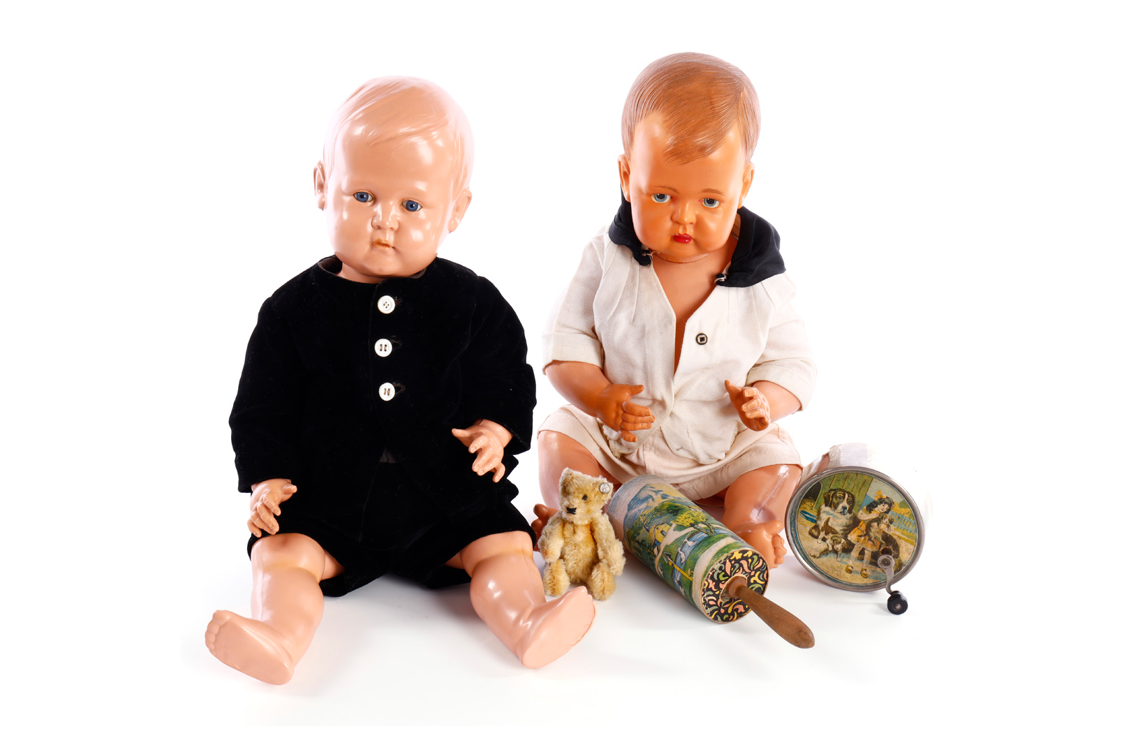 Konv. 2 Celluloid-Babys, PAUL HUNEAUS und MINERVA, Huneus Baby mit sehr schönem Ausdruck, 3 feine Haarlinien oder Kratzer am Kopf, Restaurationsstelle an der rechten Kopfnaht unten, das Minerva Baby mit Restaurationsstelle am Bein, farblich gealtert, sonst optisch guter Zustand, Größe 40 und 42, dazu als sehr schöne Dekoration, kleiner STEIFF Bär (bespielt, 1 Auge fehlt), Musikspieldose mit schönem Kindermotiv, intakt und Rassel, schöne Zusammenstellung