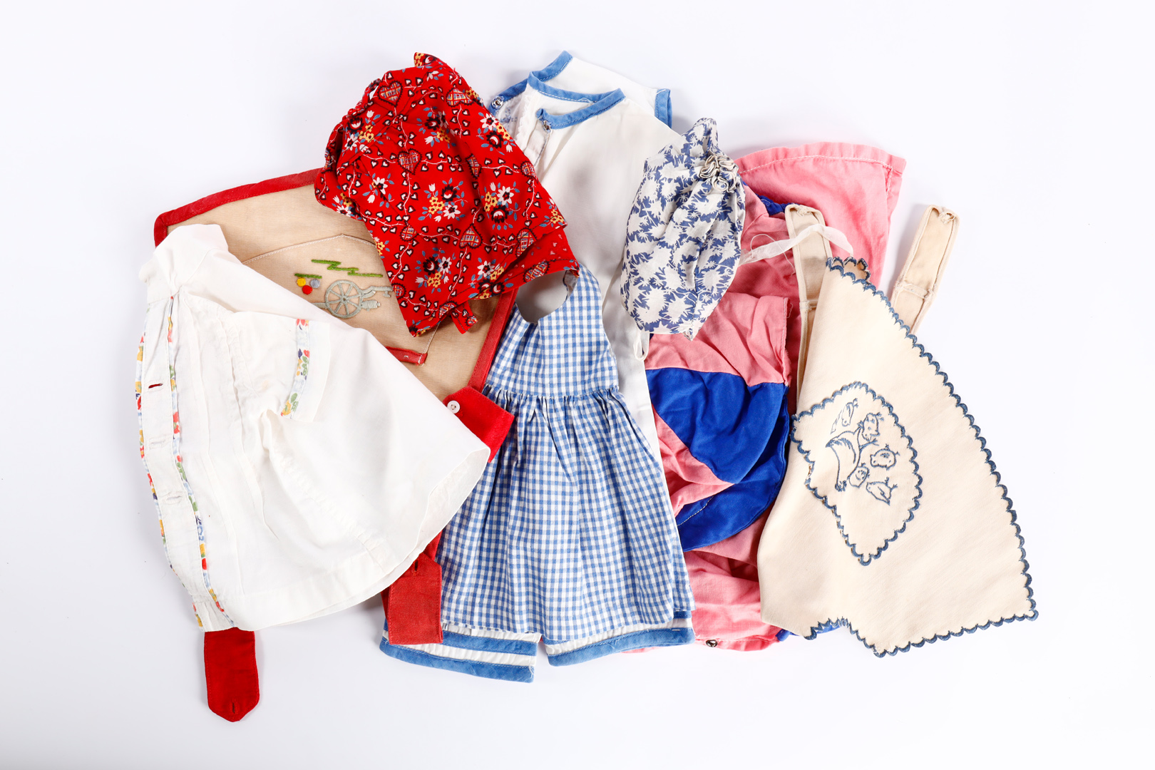 Konv. Kleidung für KÄTHE KRUSE Puppen, teilweise original, 10 Teile, darunter schönes Seidenhäubchen (minimal verschlissen, 13 cm), frühe Schürze mit Kanonenmotiv, Alterungsspuren, Länge 25 cm, leicht fleckig, für frühe Puppe I, blaues Sommer Kleidchen für kleinere Käthe Kruse Puppe etc.