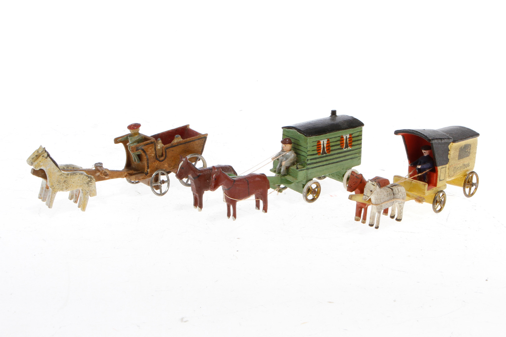 3 Erzgebirge Pferdekutschen, HL, Zinnräder, L 8,5, Z 2