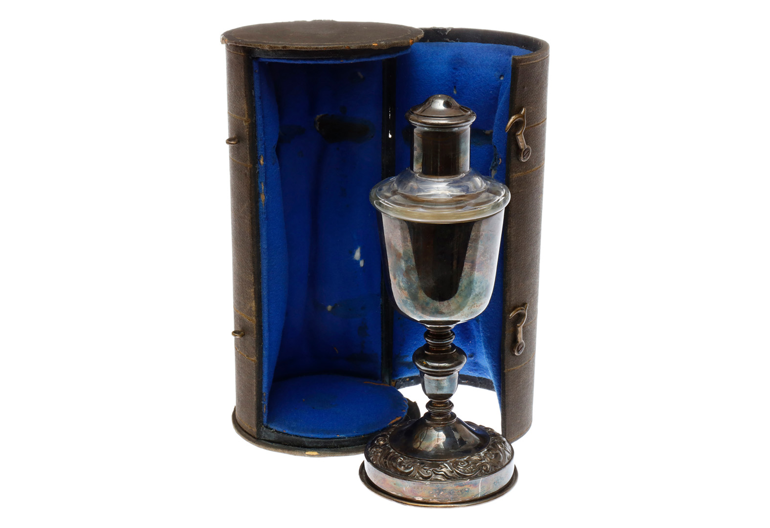 Versilberter Kelch, mit Glaseinsatz und Schraubdeckel, im 1900, H 19 cm, im Etui