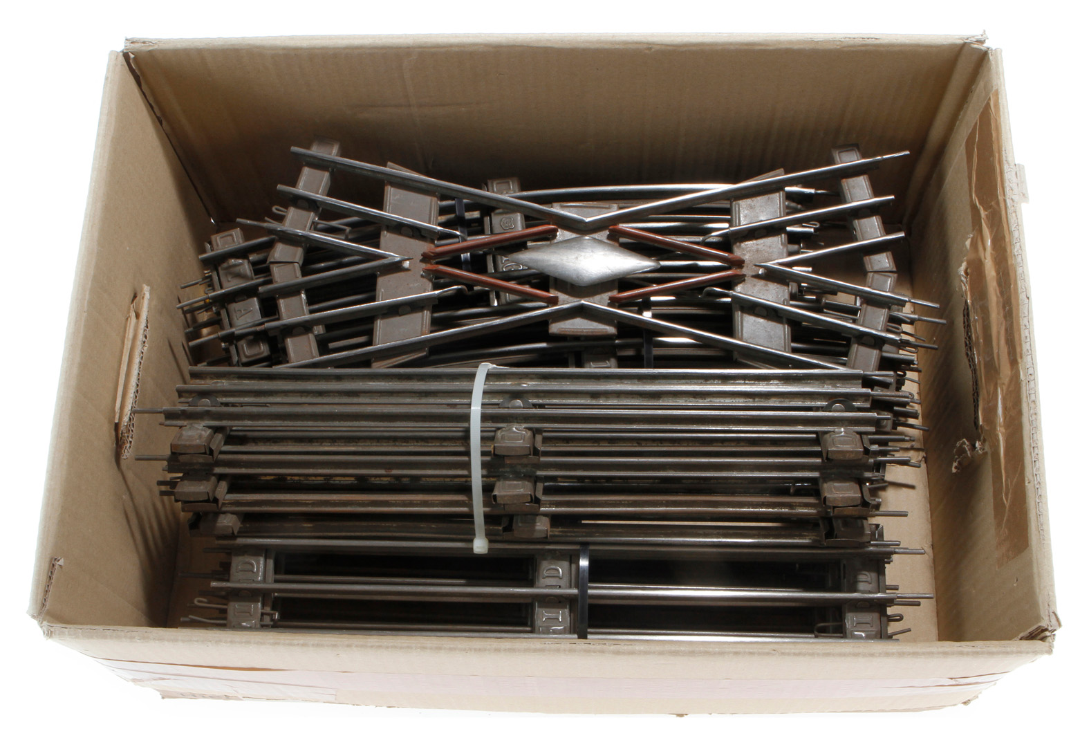 Märklin großes Gleis-Oval, Spur 1, elektr., darunter 14 gerade, 16 gebogene Gleise und Kreuzung 3611, Alterungsspuren
