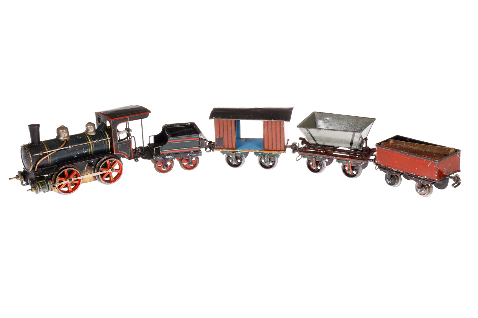 5-teiliger Märklin Spur-2-Zug, uralt, HL, mit B-Dampflok 1022, v+r, Bremse, langsam + schnell, Uhrwerk intakt, mit Galeriestangen, Stirnlampe fehlt, 2A-Tender mit Gussrädern, Packwagen, Kipplore und offener Güterwagen mit Holzladung, alte Bügelkupplungen, 3 Kupplungen def., Alterungs- und Gebrauchsspuren, LS, gealterter Lack, mit Kurbelschlüssel, in Holzkiste, Wagenlängen 14,5 und 16,5, Z 3, selten