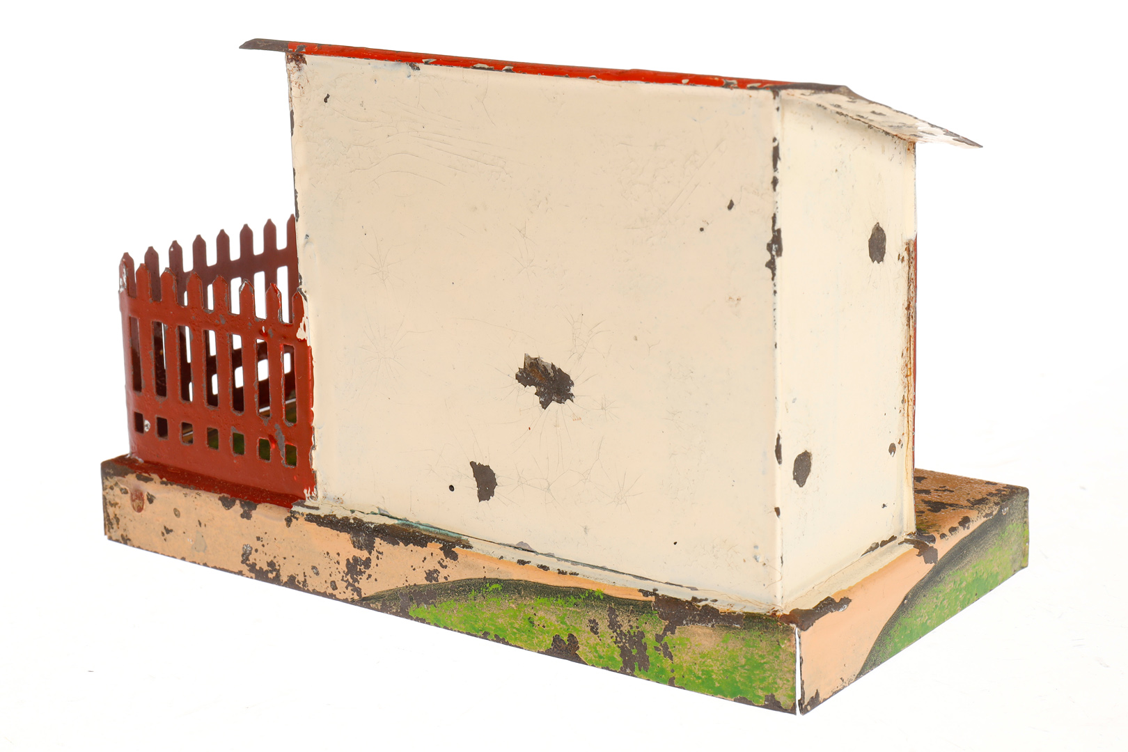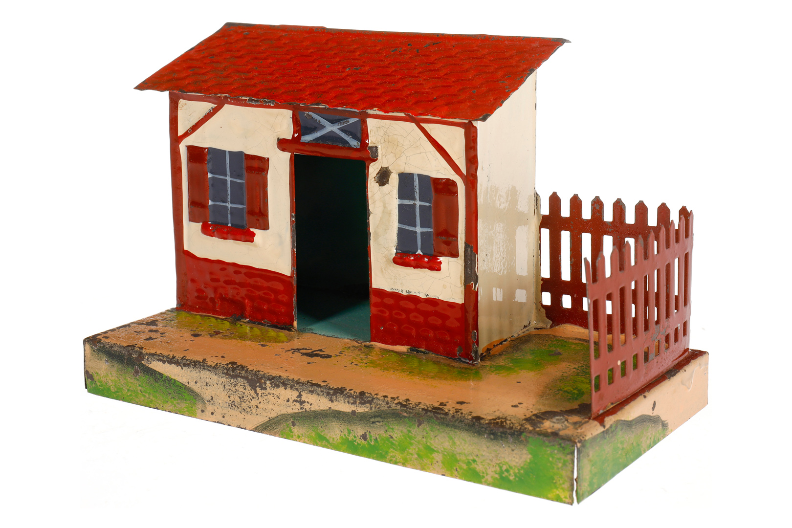 FV kleine Bahnstation, mit Zaun, uralt, handlackiert, kleine LS, L 16 cm, noch Z 2.