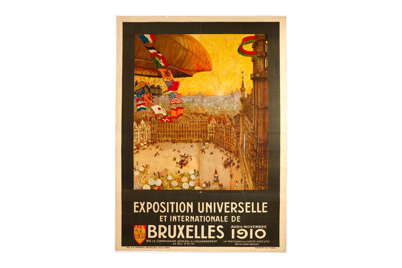 Sehr schönes Ausstellungsplakat ”Exposition universelle et internationale de Bruxelles 1910”, Imp. J.-E. Goosens, Bruxelles/Lille/Paris, eine Faltkante leicht eingerissen, 124 x 90