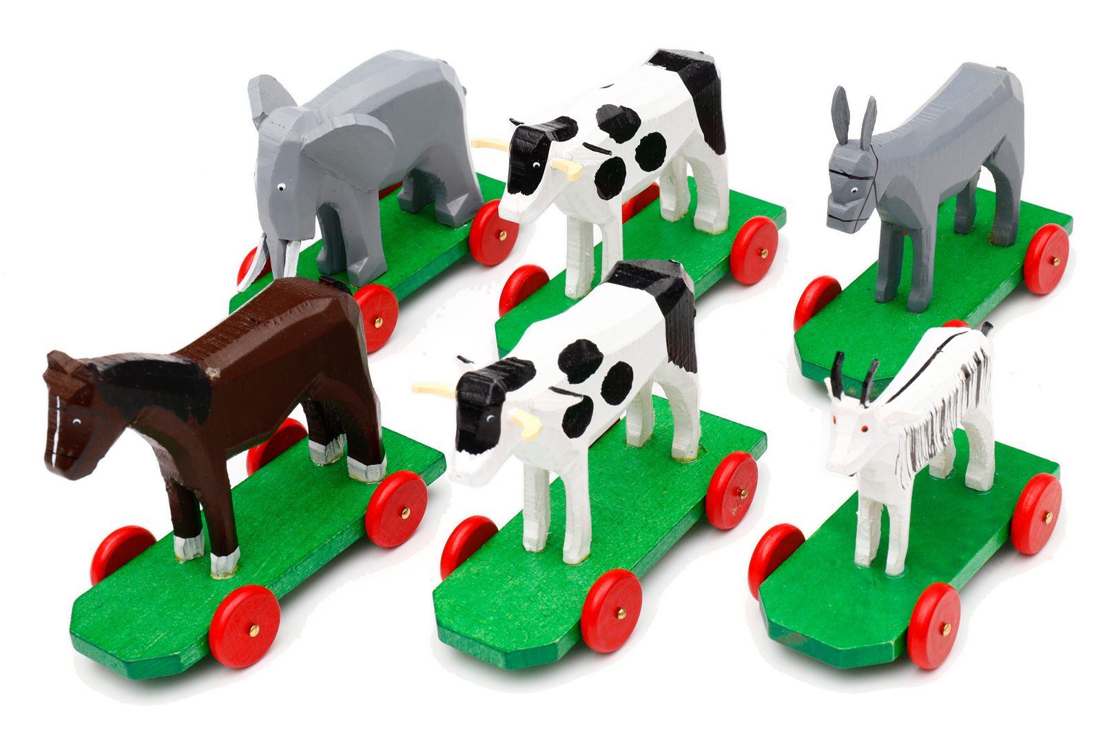 Konv. ”Drechsel Grünhainichen” Tiere auf Rädern, Erzgebirge, Holz, bemalt, L 10,5, Z 2