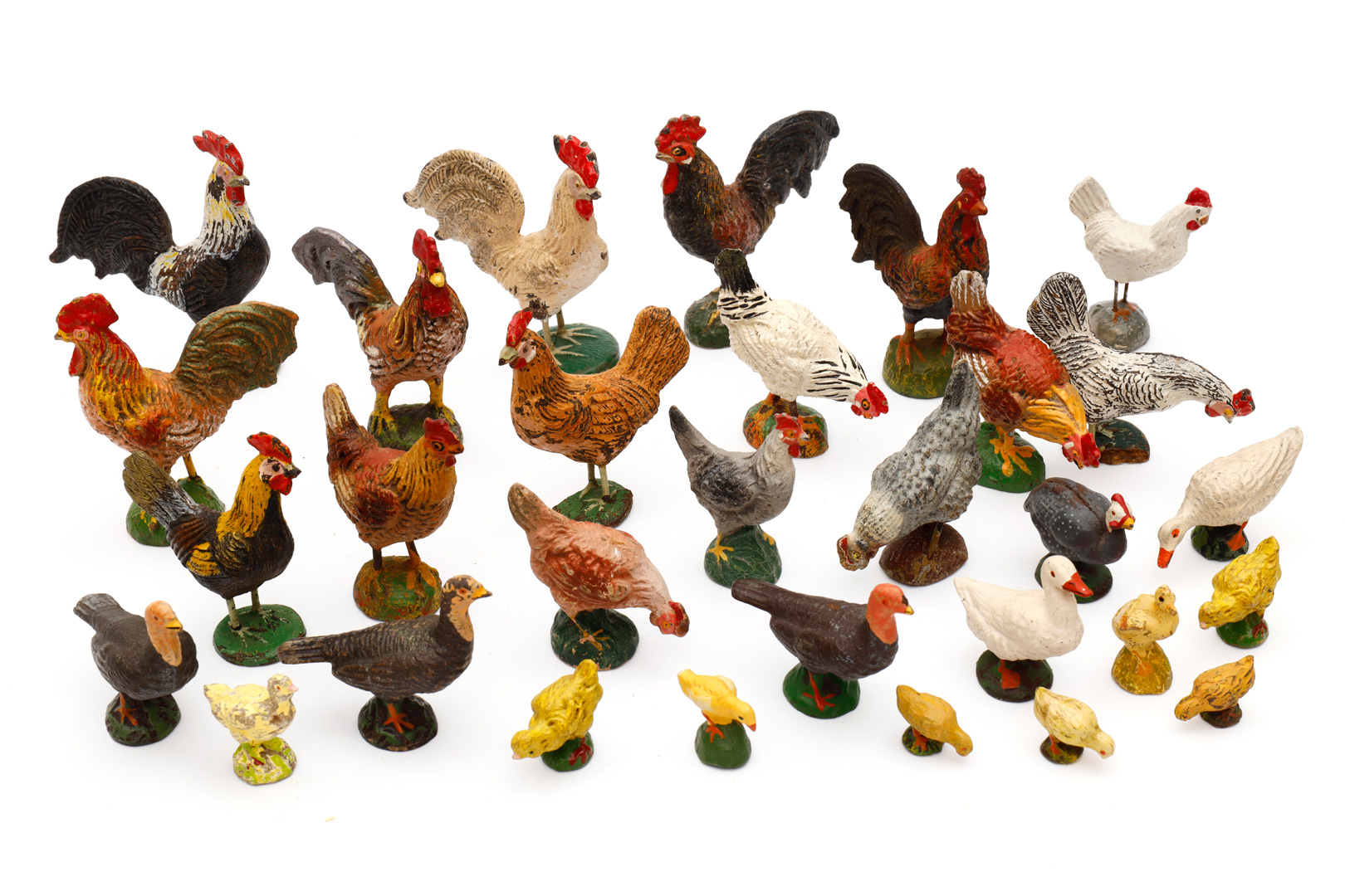 Konv. Federvieh, ca. 30 Vögel, Elastolin/Lineol u.a., Masse, HL, L 2-6, Z 2 und Z 3