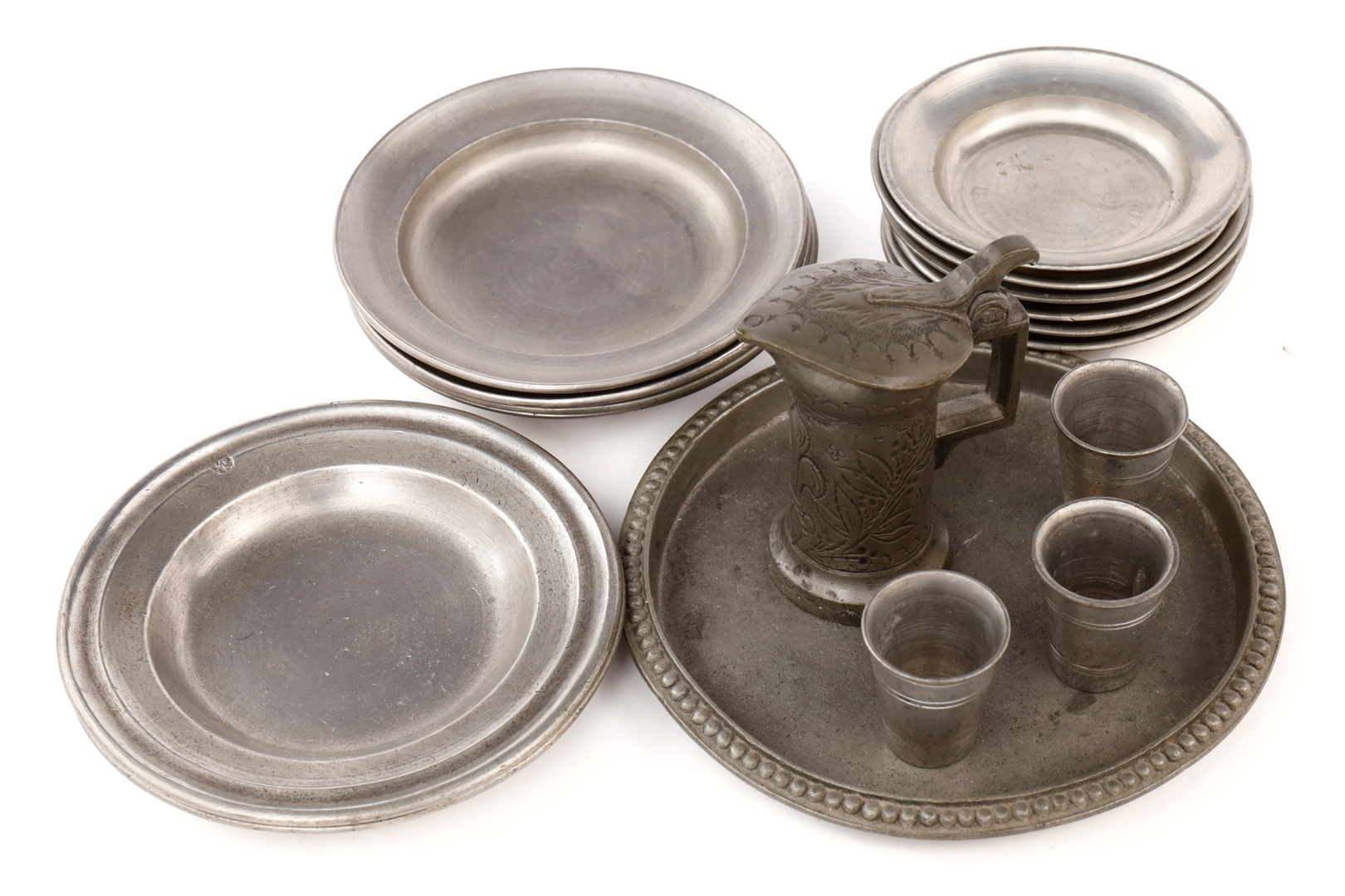 Konv. Zinn für die Rauchfangküche, 19. Jh., 1 x Satz von 4 Tellern, Durchmesser 7,8 cm, davon 2 Teller mit Nürnberger Meistermarken, 1 x 2 Teller als Paar, ebenfalls gestempelt, Durchmesser 8 cm und 1 x Satz von 6 Tellern, Durchmesser 5,6 cm, dazu Platte mit Krug und 3 Bechern