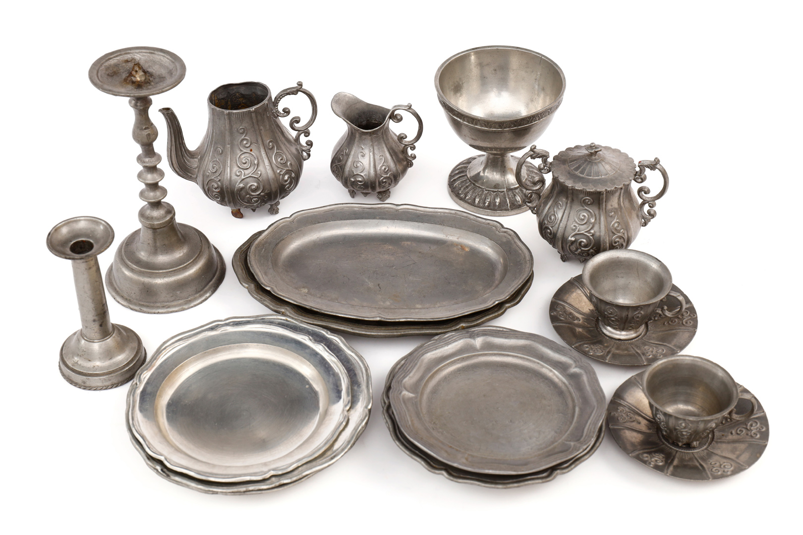 Konv. Zinn für die Puppenküche, 19.Jh./um 1900, darunter sehr schöne Teller, Durchmesser 7,5-9 cm, 2 Platten. Länge 11 und 12 cm, Service, 1 Deckel fehlt. 2 Leuchter und ein Becher