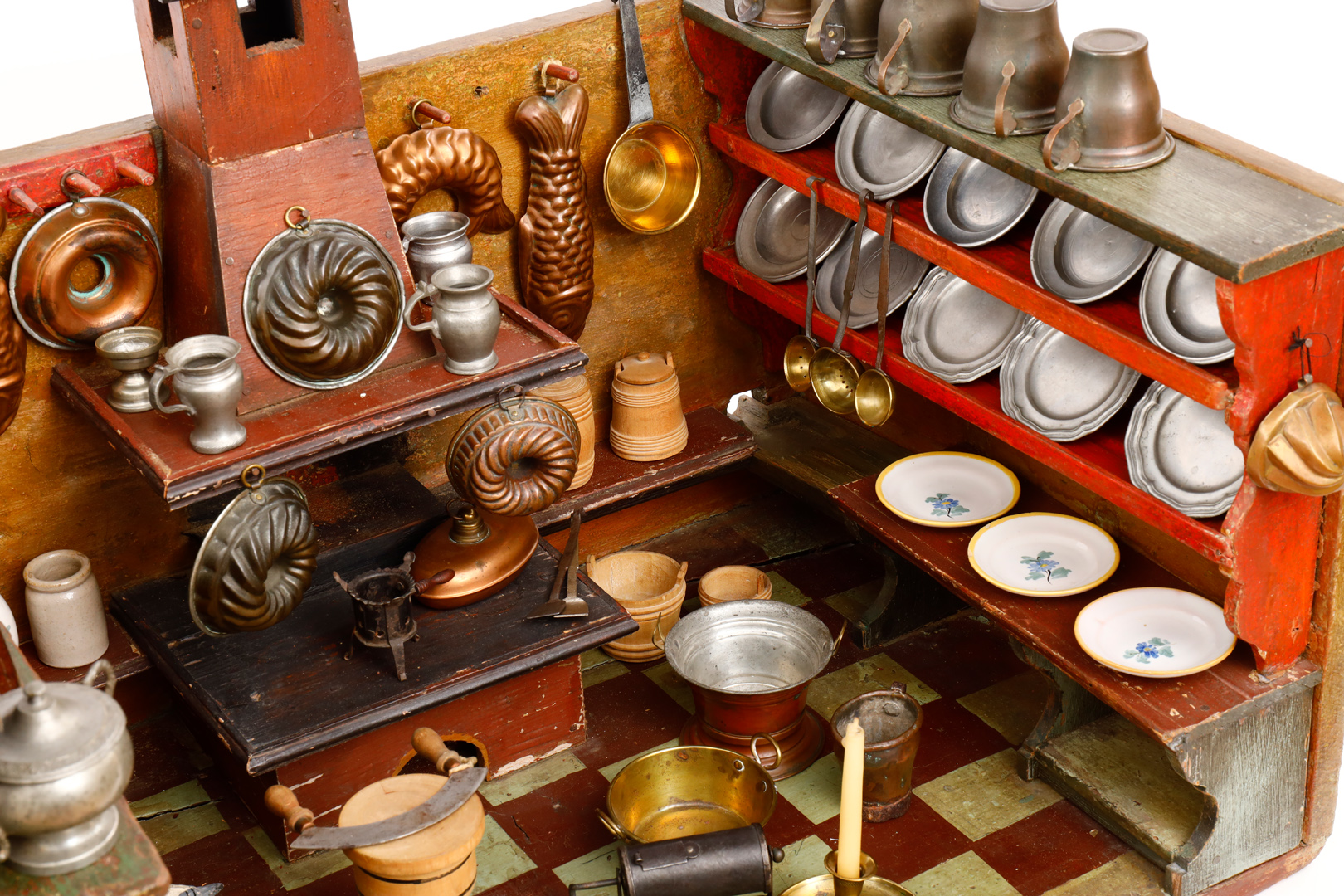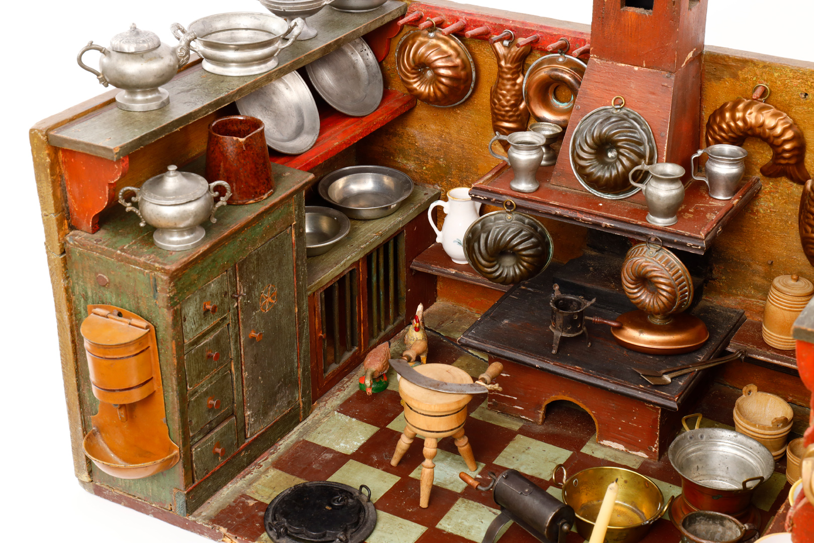 Rauchfangküche um 1830/50, mit Rauchfang, Feuerstelle und Hühnerstall, alte Bemalung, unter dem Rauchfang mit gemaltem offenem Feuer, Boden mit Schachbrettmuster, mit viel Zubehör, darunter Biedermeier-Zinn wie Terrine, Kanne, Schüsseln, Teller, Biedermeierkupfertöpfe, frühe Fayencen etc., altersbedingter Spannungsriss am Boden, Breite 56 cm, Höhe 35,5 cm, Tiefe 36 cm