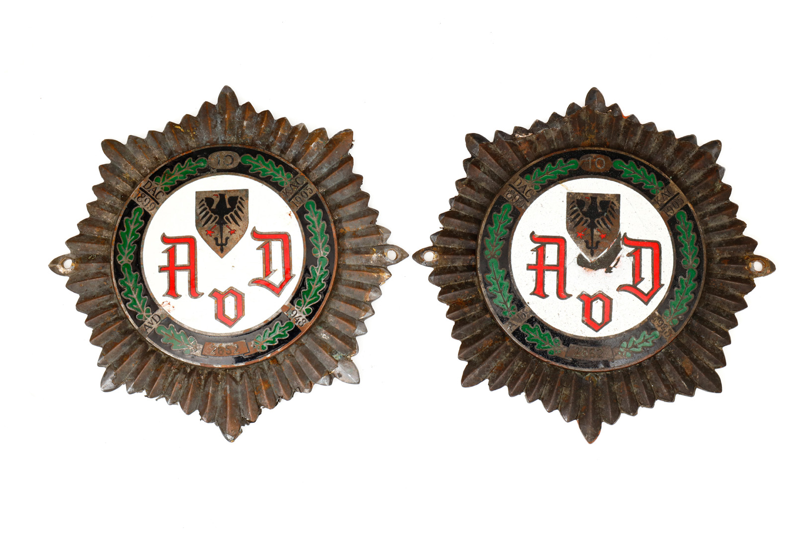 2 AVD Automobil-Plaketten (Badges), emailliert, teilweise Abschläge im Emaille, Durchmesser 10 cm, Z 3