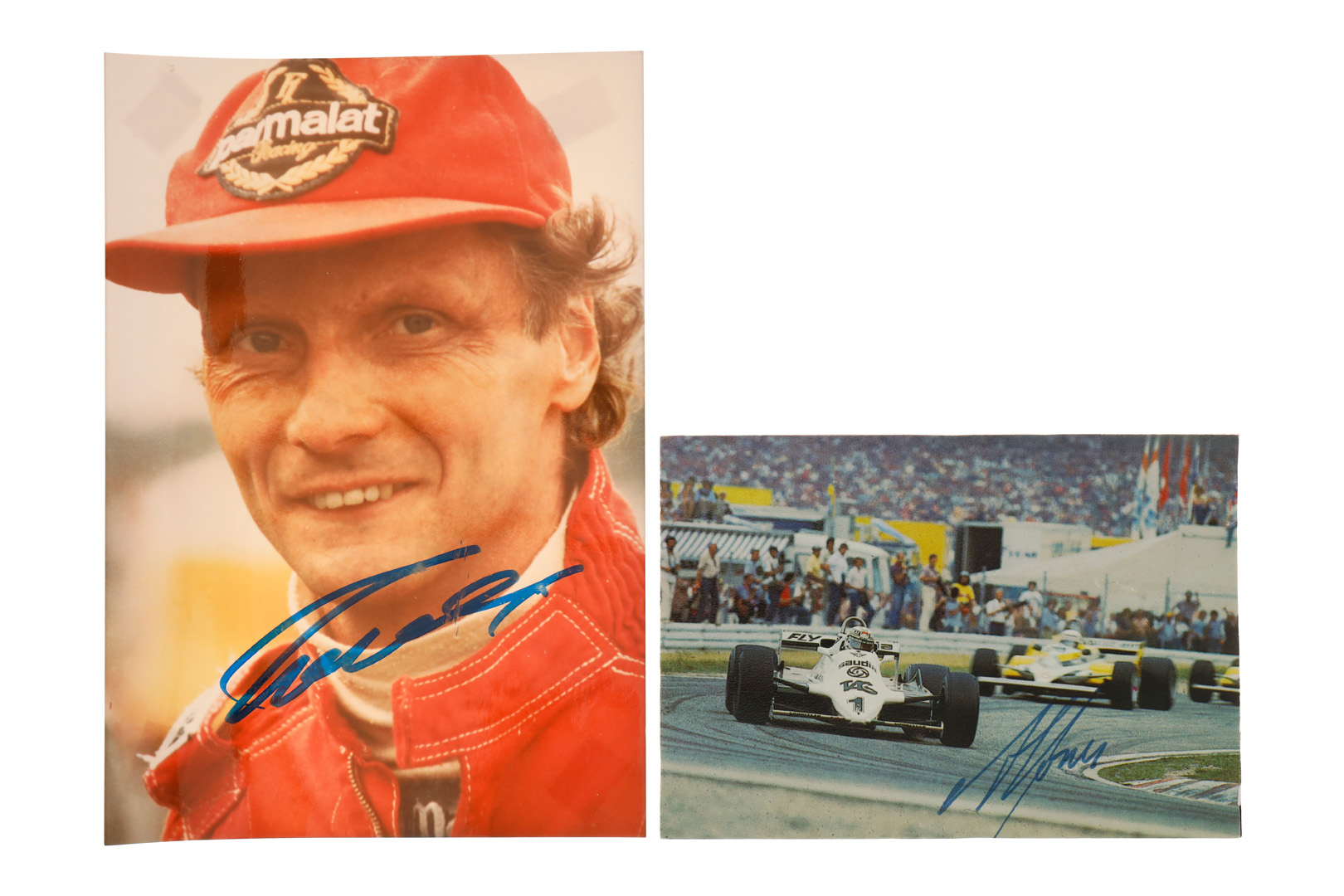 2 Autogramm-Karten, mit Original-Unterschrift von Niki Lauda und F1-Weltmeister 1980 Alan Jones