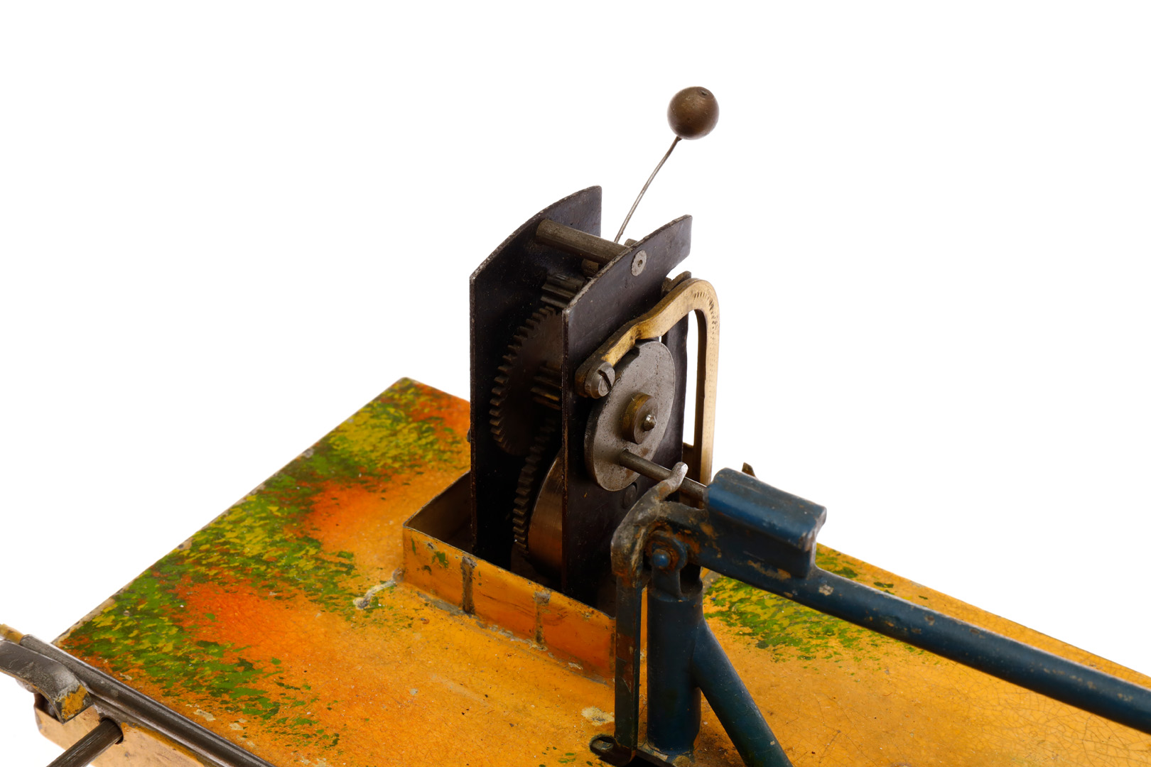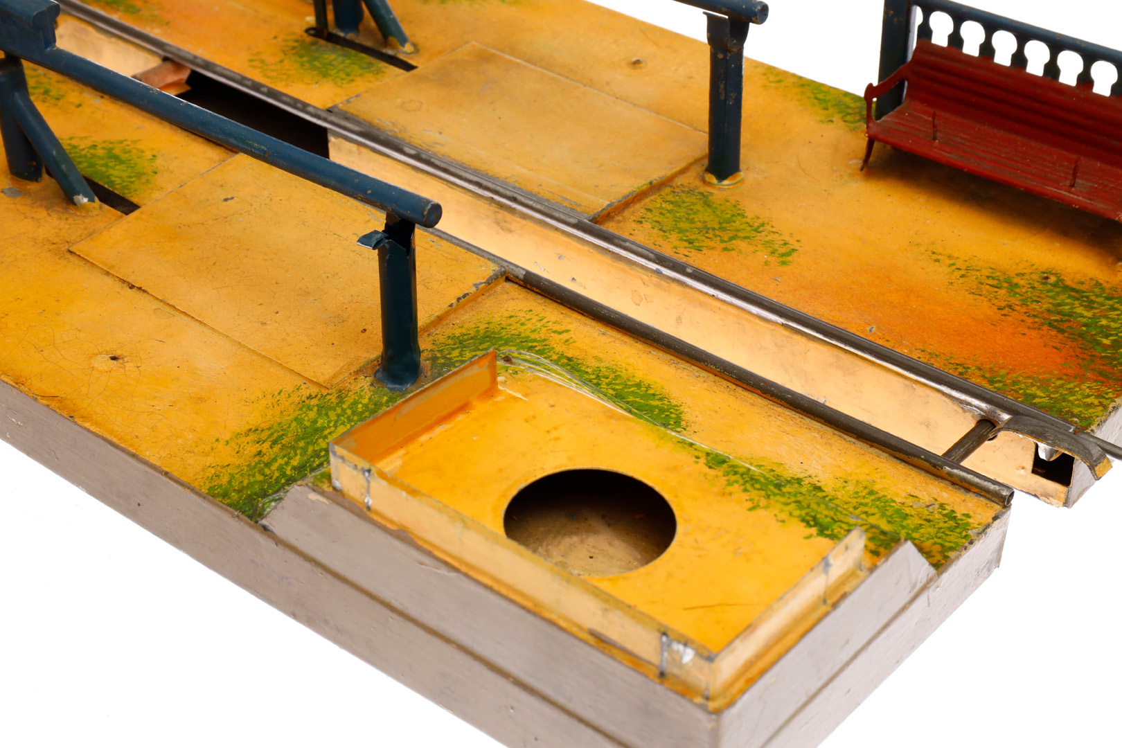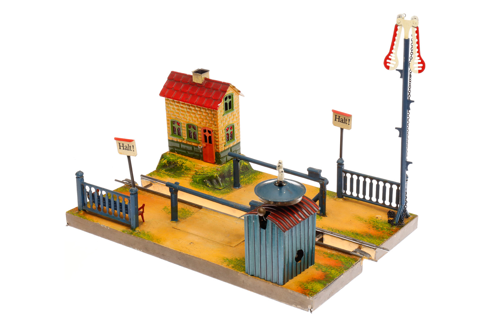 Märklin Bahnübergang 2174, uralt, HL, variable Spur, mit Zugauslösung, Uhrwerk intakt, Signal, Schilder und 1 Schrankenaufnahme ersetzt, LS tw ausgebessert, gealterter Lack, L 35,5, sonst noch Z 2-3