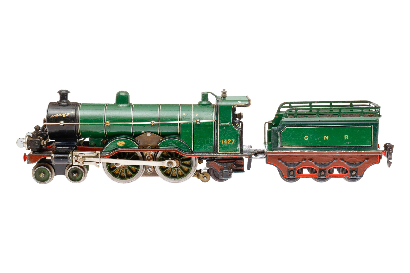 Märklin engl. 2-B-1 Dampflok ”1427” CE 3020 GNR, Spur 0, Starkstrom, grün/schwarz, mit Tender und 2 el. bel. Stirnlampen, vorderer Plattformbereich von Lok tw nachlackiert, LS tw ausgeb., gealterter Lack, sonst noch Z 2-3