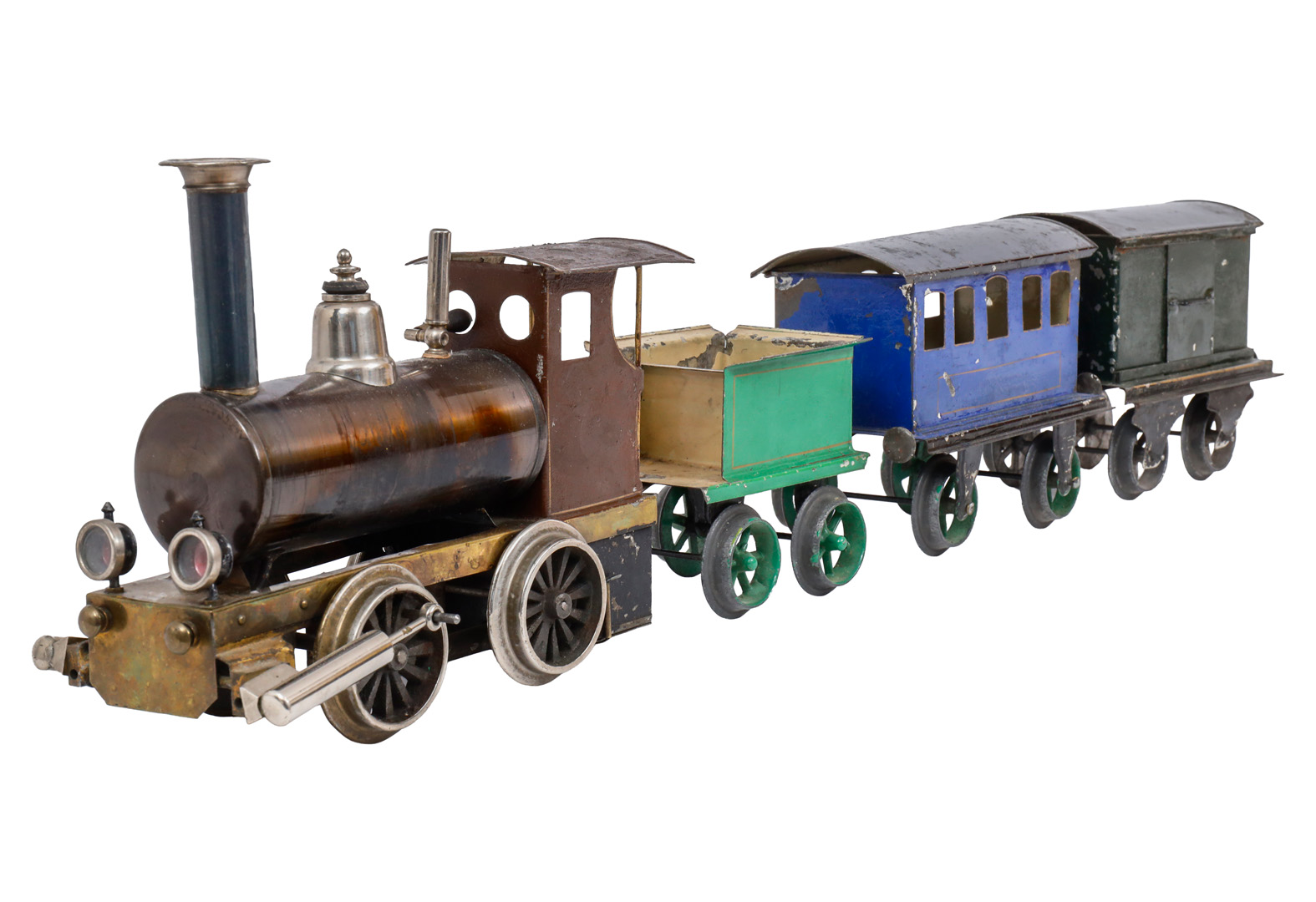 Plank 4-teiliger Uralt-Zug, Spurweite 70 mm, uralt, HL, mit Spirituslok, Tender, Personen- und Packwagen, Lok mit Brenner, Pfeife und Laternen, oszill. Zylinder, Alterungs- und Gebrauchsspuren, 2 Pufferteller fehlen, Wagenlänge 15,5, Z 3