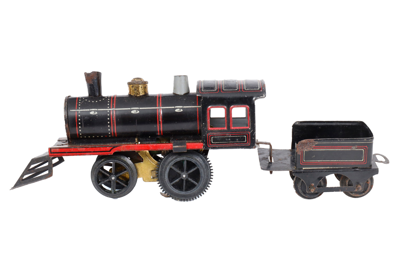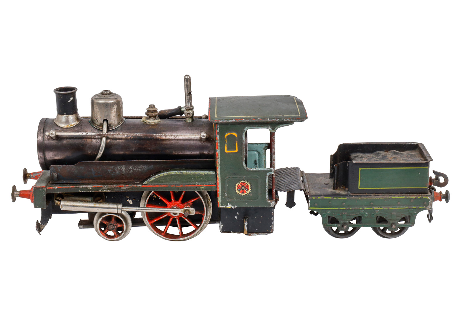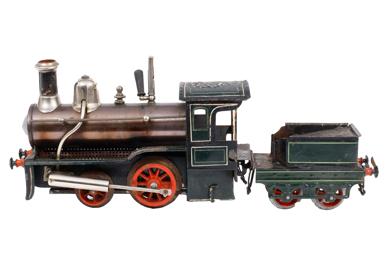 Carette 1-A Dampflok, mit 2A-Tender, Spur 1, spiritusbetrieben, HL, mit patiniertem Kessel, Pfeife und Brenner, oszill. Zylinder, Alterungs- und Gebrauchsspuren, Z 2-3