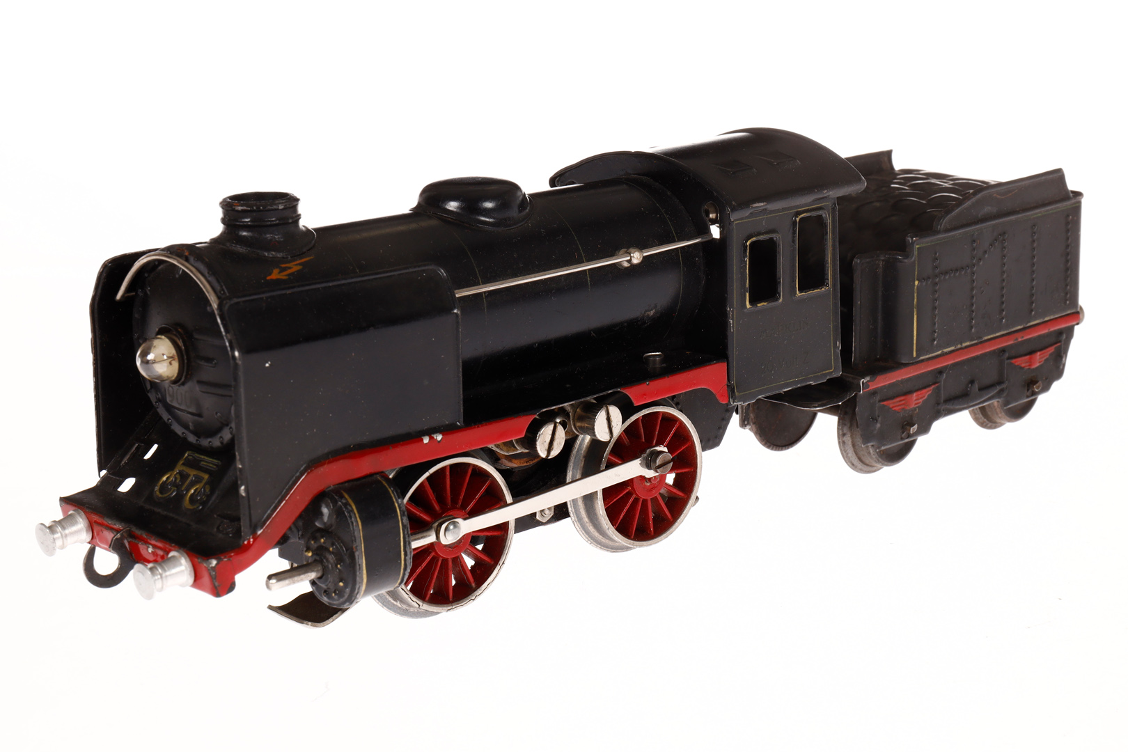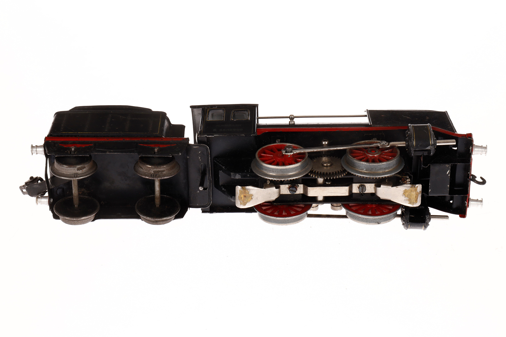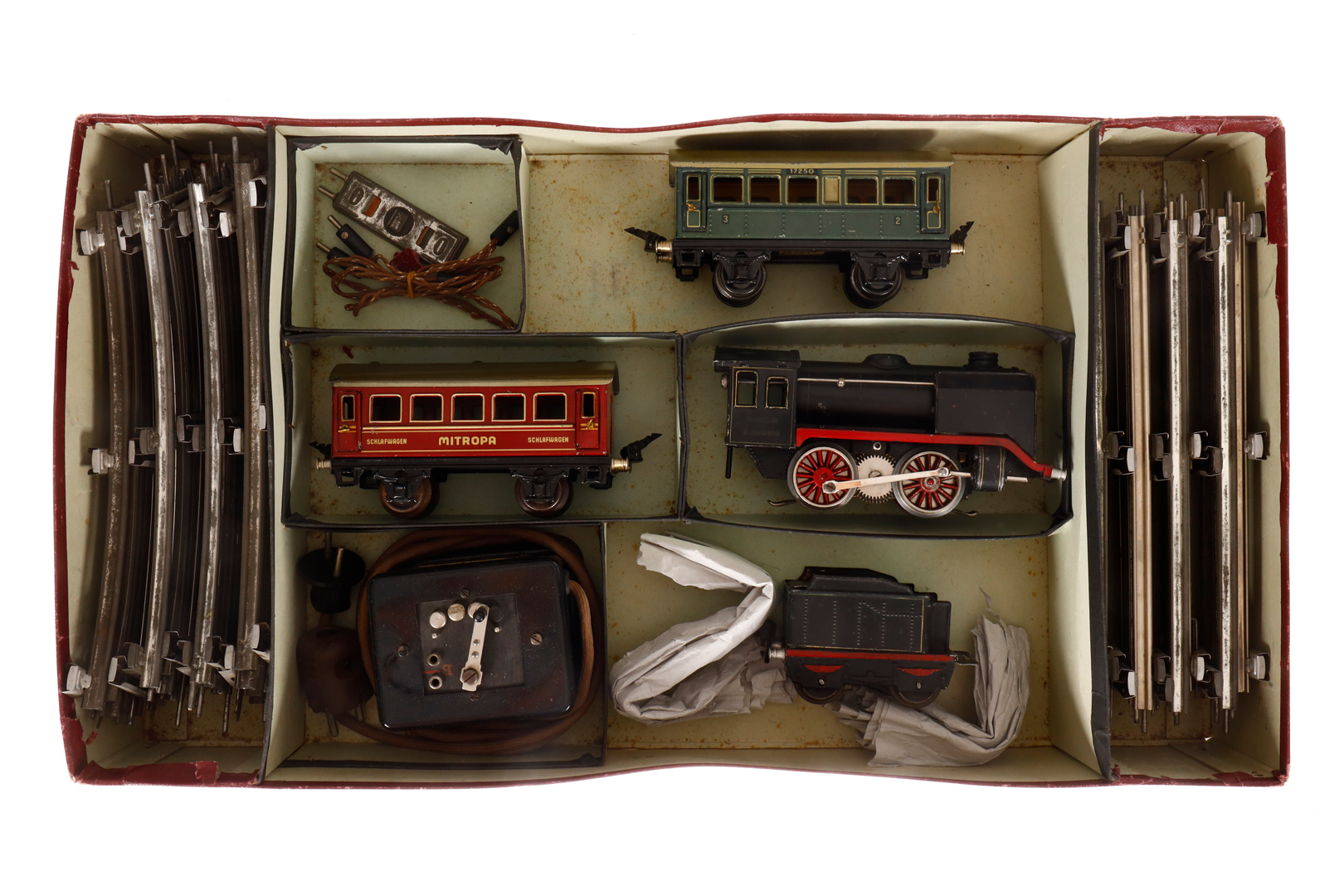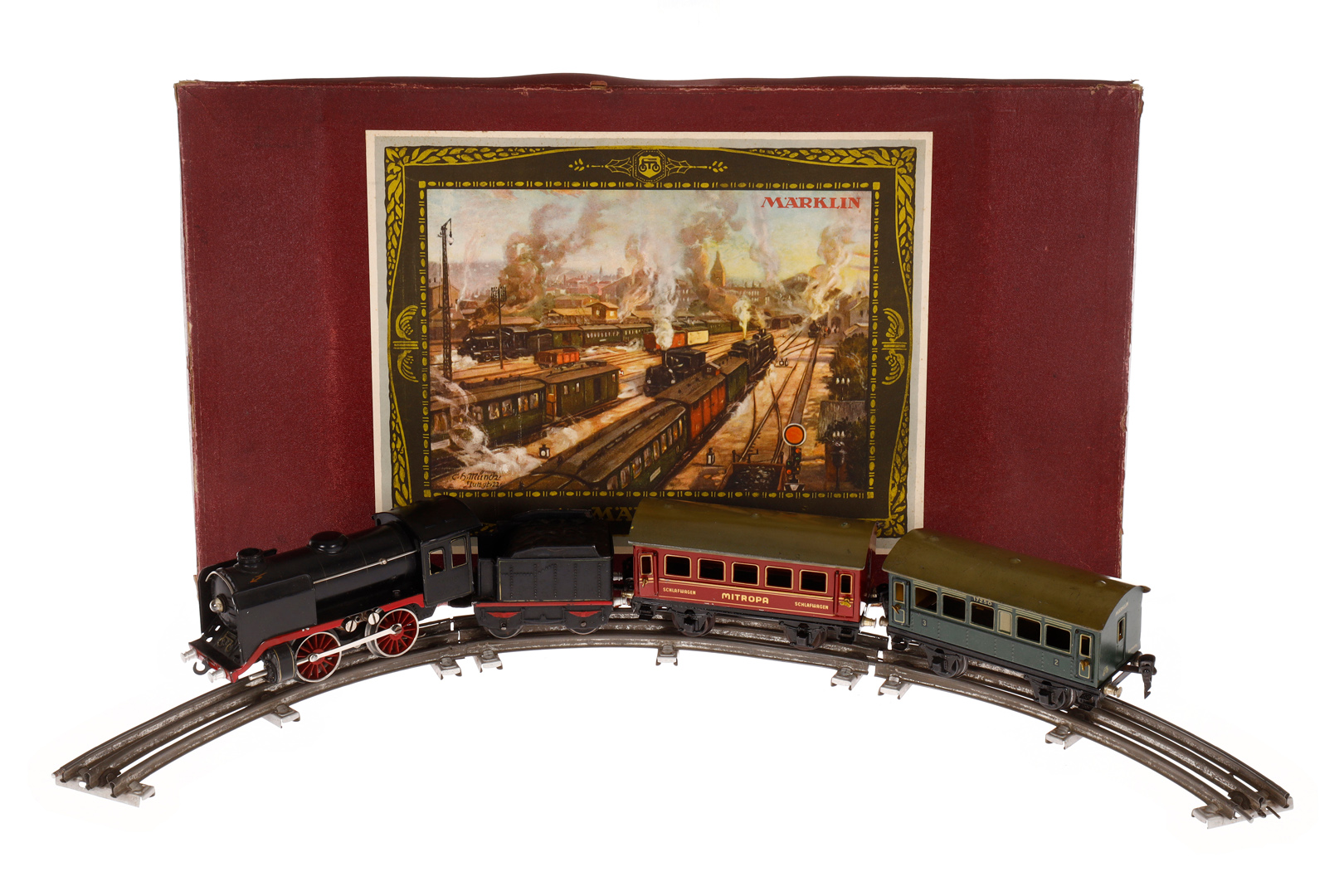 Märklin Zugpackung R 66/12900/25/3 Z, Spur 0, elektr., mit Dampflok, Tender, 2 Wagen (1 fehlt), Trafo, Stoffkabel, Anschlussstück und Schienenmaterial, LS und gealterter Lack, Wagenlänge 16,5, im tw besch. OK, sonst noch Z 2-3