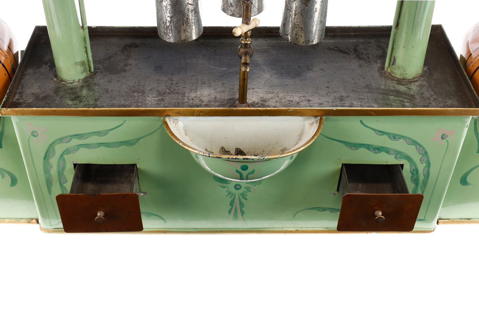Rock & Graner (zugeschrieben) Restaurations-Büfett, uralt, handlackiert, mit 2 Fässern, Wasserbecken, Ausgusshahn und 2 Schubfächern mit Kupferfront, dazu versch. Weißblechgeschirr, leichte Alterungsspuren, kleine LS, mit Wasserreservoir, oben einfüllbar, 60 x 20 x 50 cm, schöner originaler dekorativer Zustand. (Puppen nur Dekoration, nicht dazugehörig)