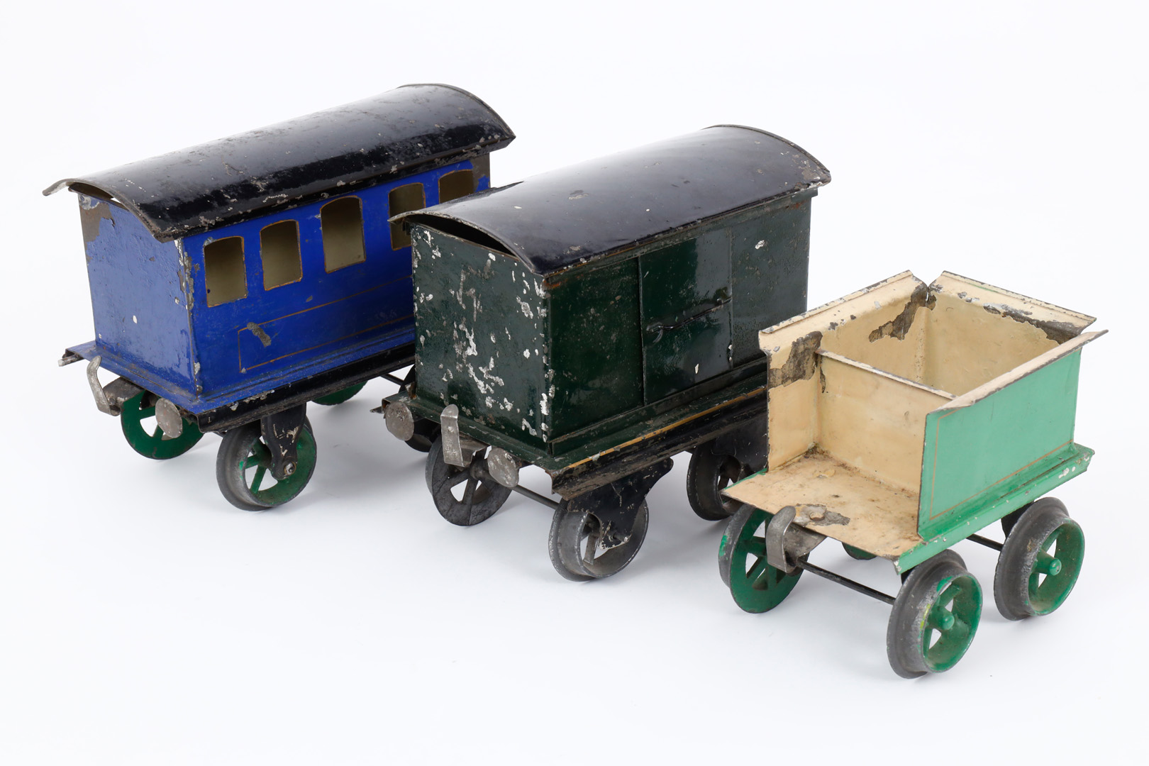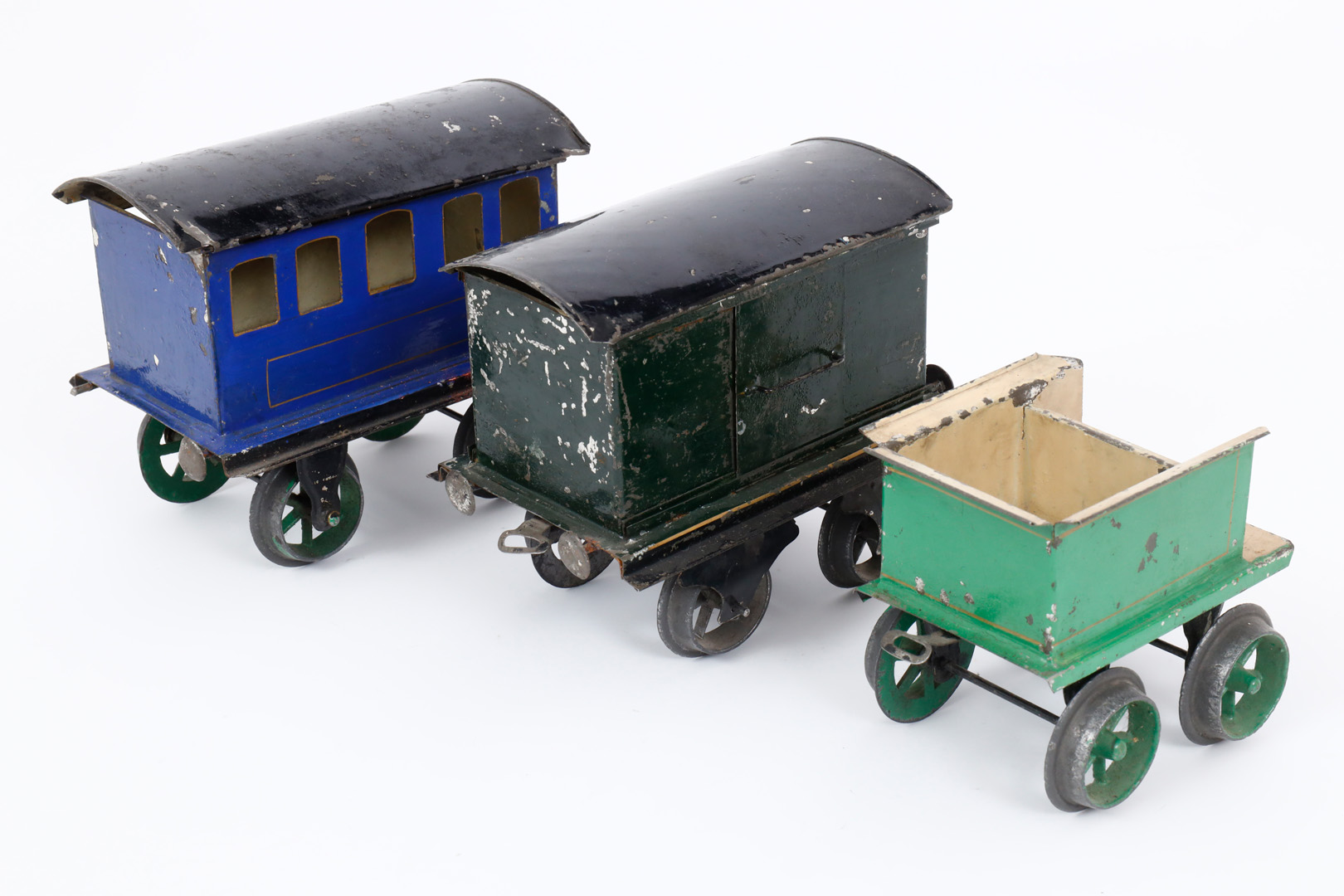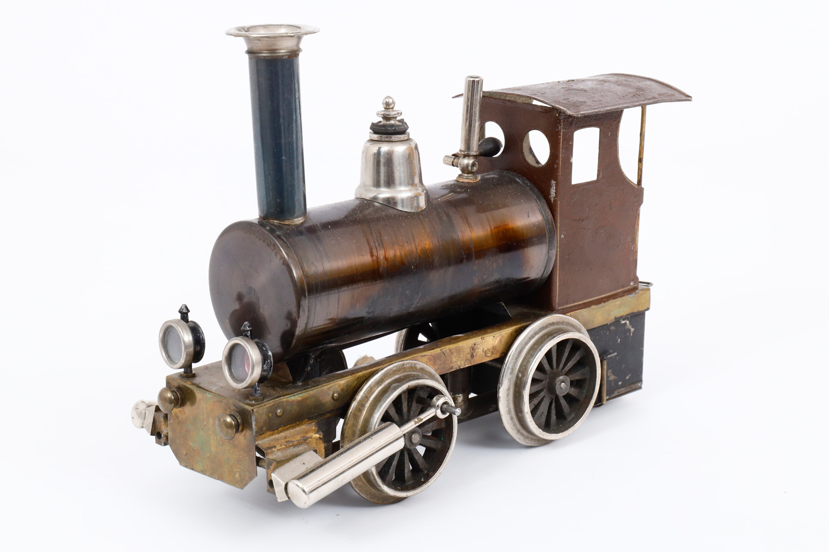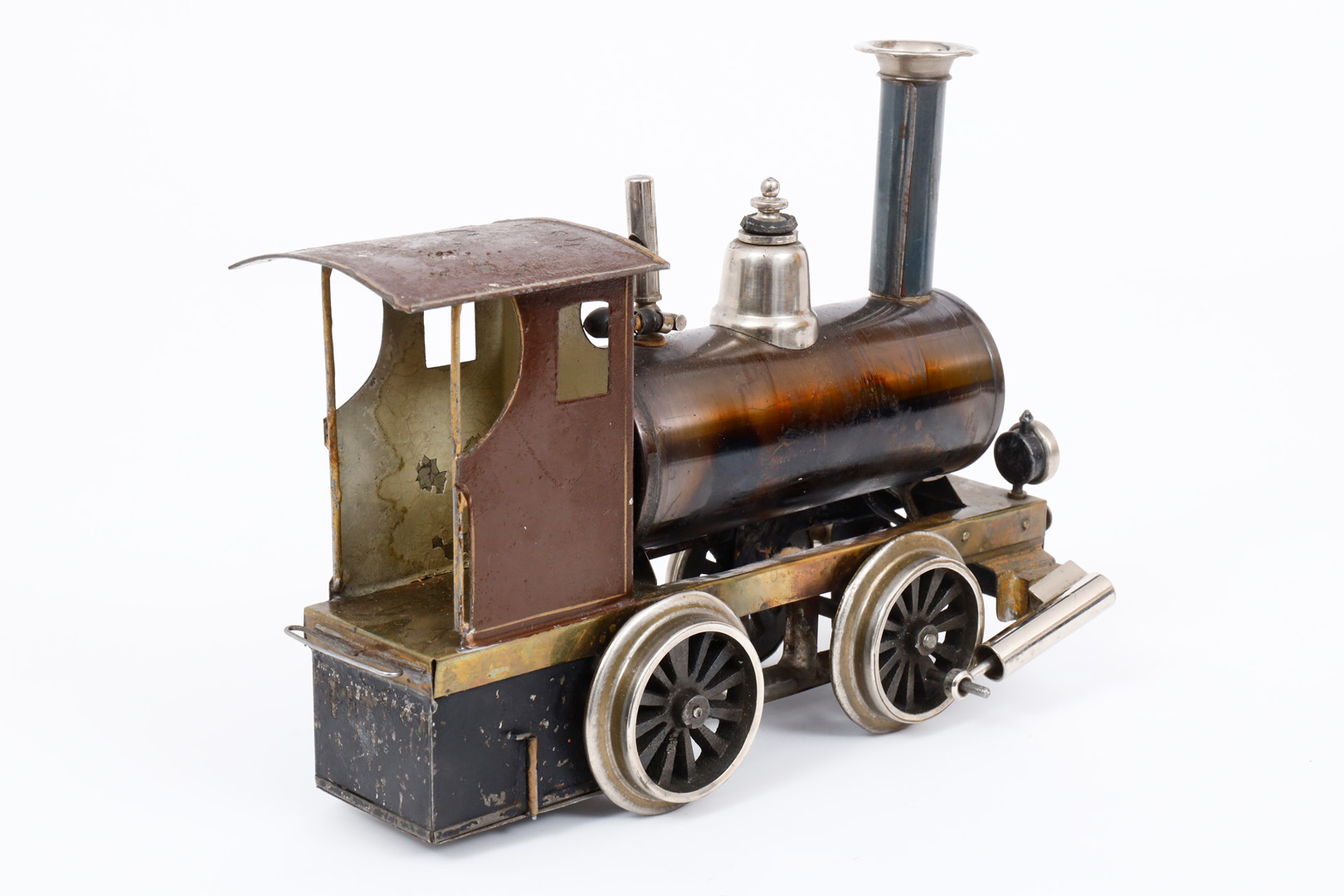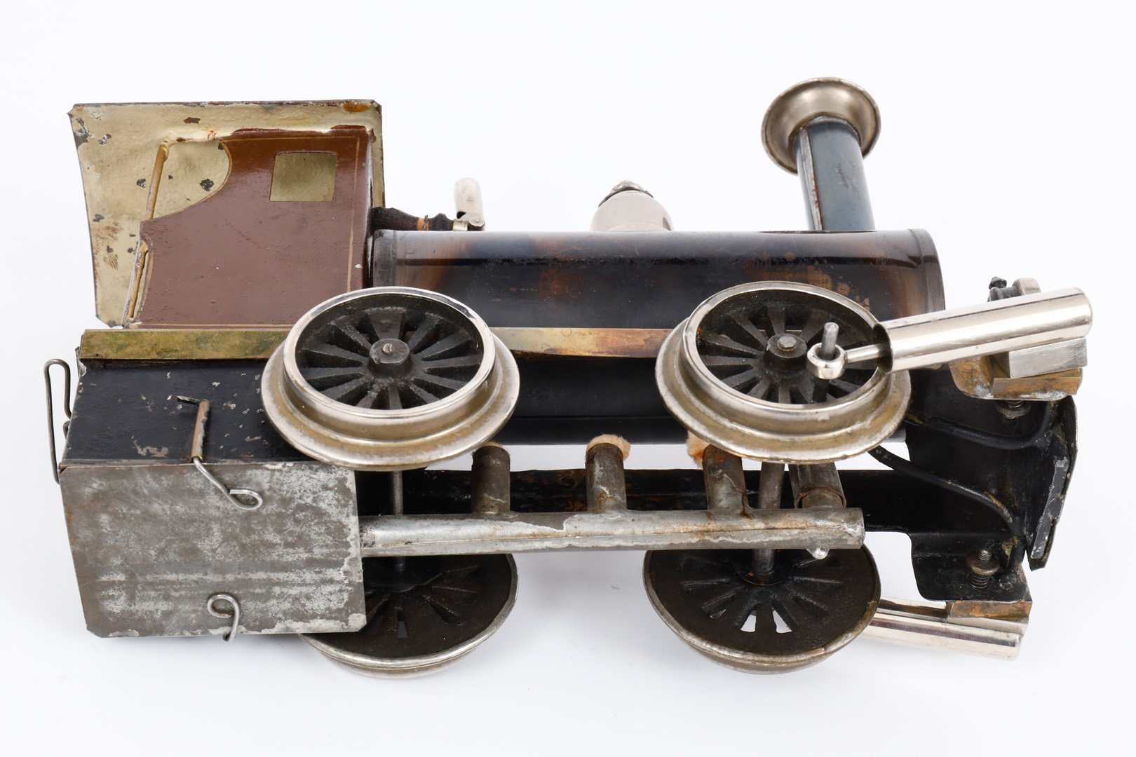 Plank 4-teiliger Uralt-Zug, Spurweite 70 mm, uralt, HL, mit Spirituslok, Tender, Personen- und Packwagen, Lok mit Brenner, Pfeife und Laternen, oszill. Zylinder, Alterungs- und Gebrauchsspuren, 2 Pufferteller fehlen, Wagenlänge 15,5, Z 3