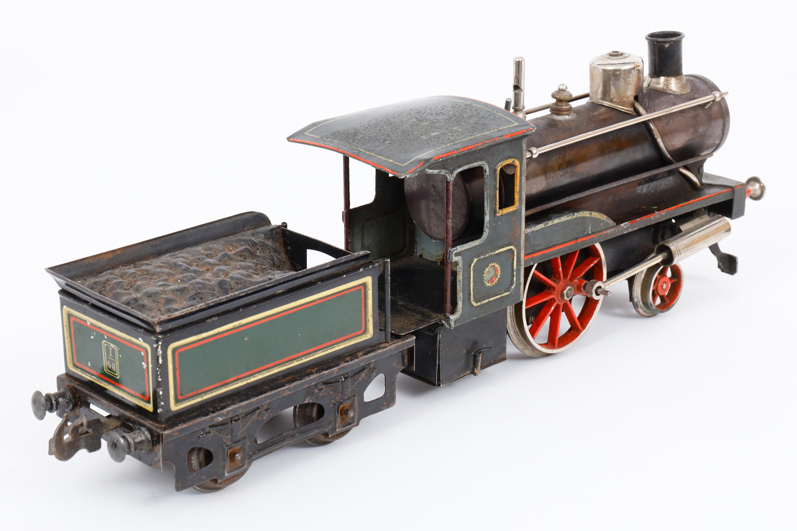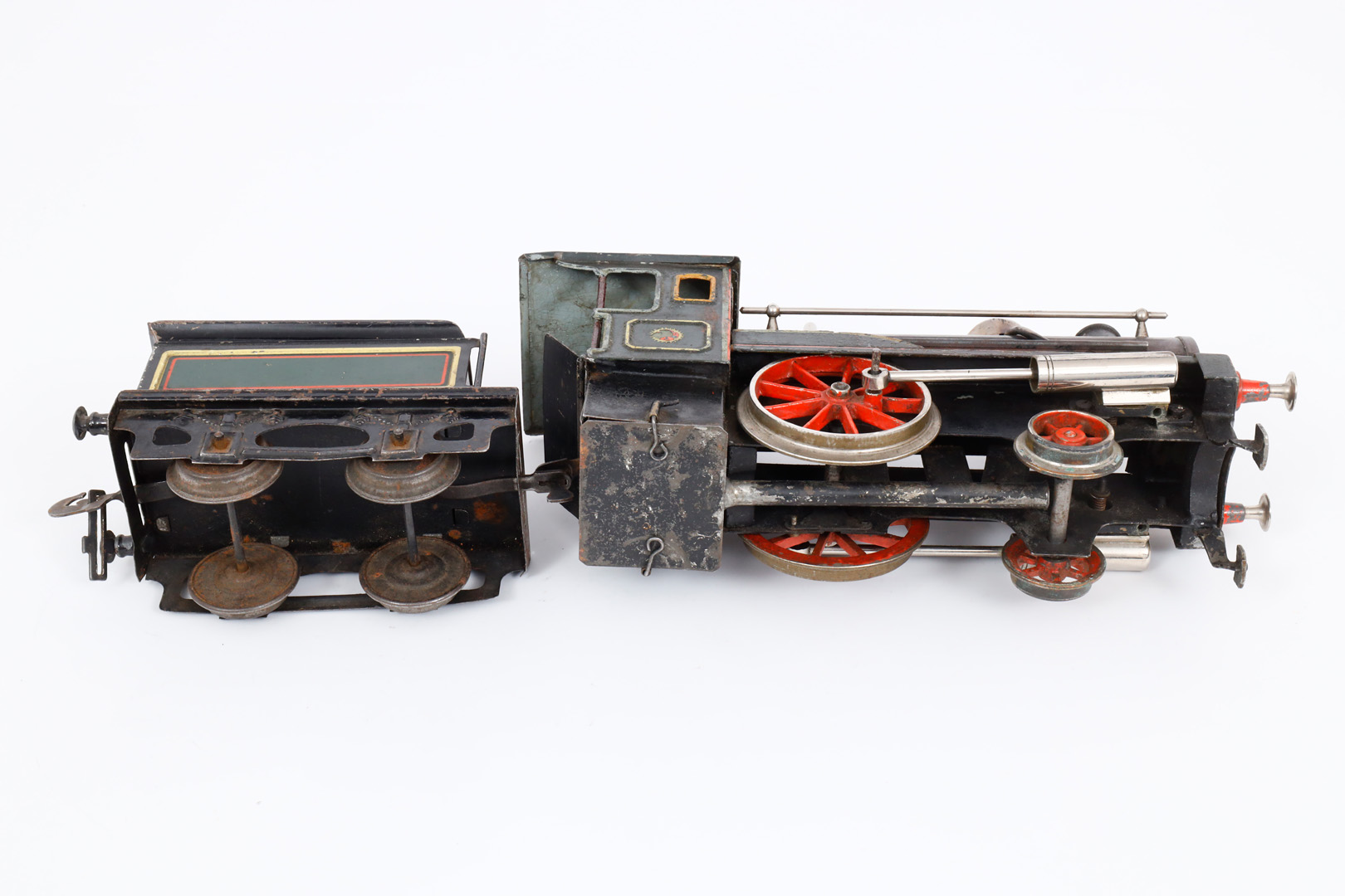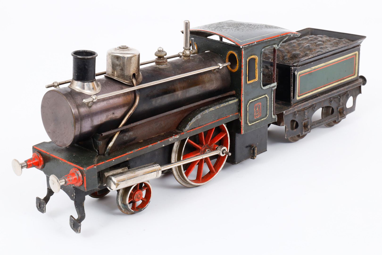 Carette 1-A Dampflok, mit 2A-Tender, Spur 1, spiritusbetrieben, HL, mit patiniertem Kessel, Pfeife und Brenner, oszill. Zylinder, Alterungs- und Gebrauchsspuren, Z 2-3