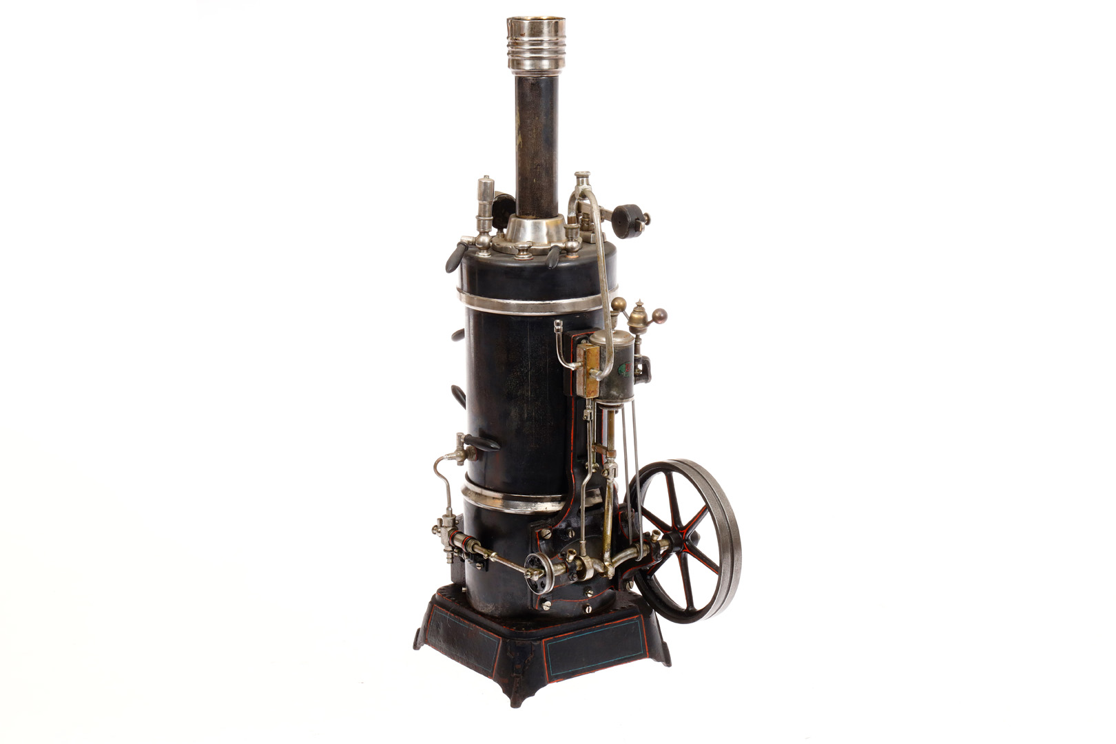 Große Doll stehende Dampfmaschine Nr. 359/5, patinierter Kessel, KD 11, komplett mit Armaturen, Brenner und Speisepumpe, feststehender doppeltwirkender Zylinder, Guss-Sockel HL, H 50,5, leichte Gebrauchsspuren, noch Z 2 ”Big Doll steam engine”